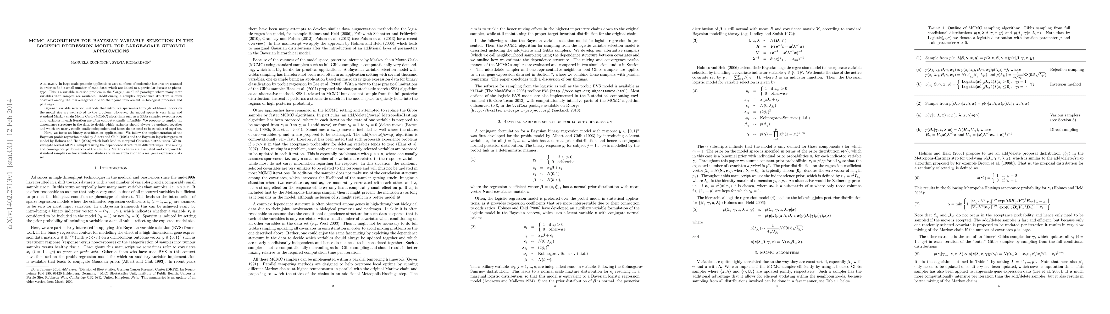 This paper proposes advanced MCMC algorithms for Bayesian variable selection in the logistic regression model for large-scale genomic applications, focusing on binary classification. It addresses the computational challenges of the "large p, small n" paradigm by leveraging the dependence structure among variables to improve efficiency.