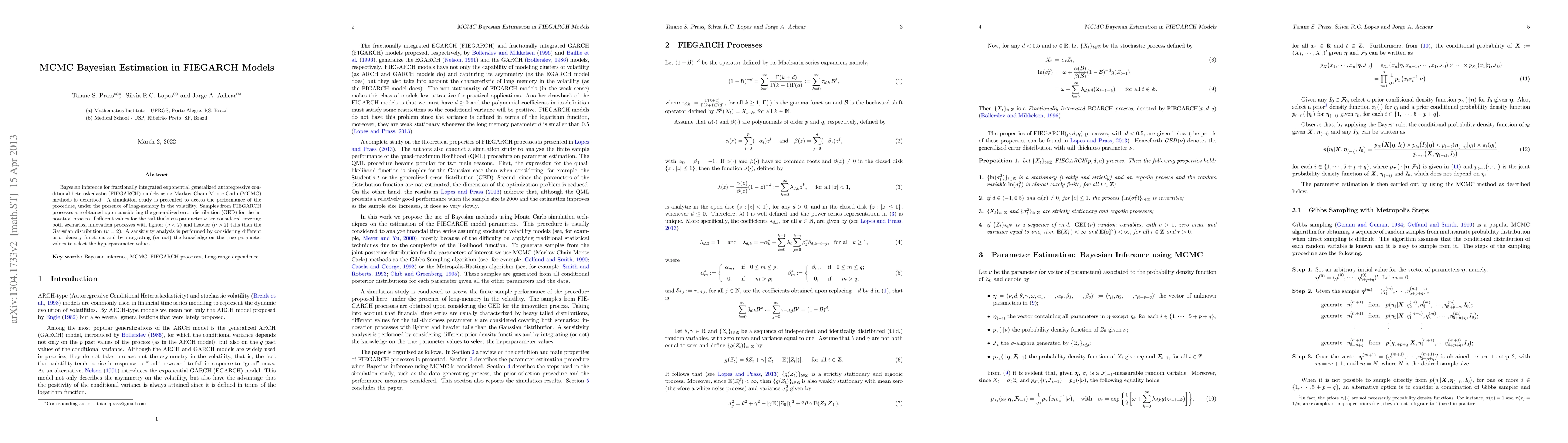 This paper details Bayesian inference for FIEGARCH models using MCMC methods, assessing the procedure's performance via simulation studies under long-memory volatility conditions. The study explores the impact of different tail-thickness parameters and sensitivity to prior density functions, using the generalized error distribution for innovations.