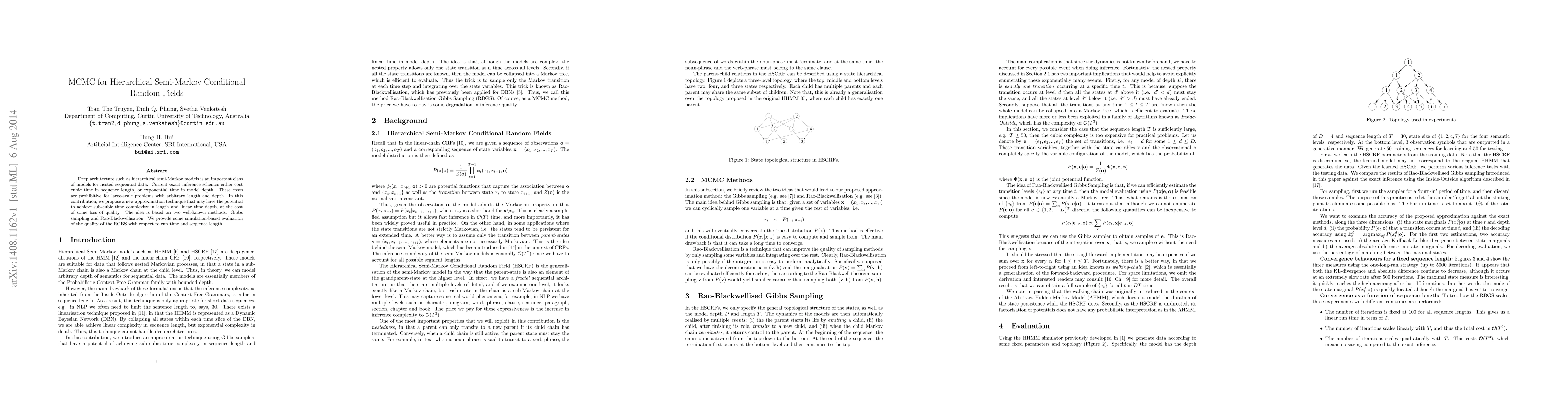 Deep architecture such as hierarchical semi-Markov models is an important class of models for nested sequential data. Current exact inference schemes either cost cubic time in sequence length, or exponential time in model depth. These costs are prohibitive for large-scale problems with arbitrary length and depth. In this contribution, we propose a new approximation technique that may have the potential to achieve sub-cubic time complexity in length and linear time depth, at the cost of some loss of quality. The idea is based on two well-known methods: Gibbs sampling and Rao-Blackwellisation. We provide some simulation-based evaluation of the quality of the RGBS with respect to run time and sequence length.