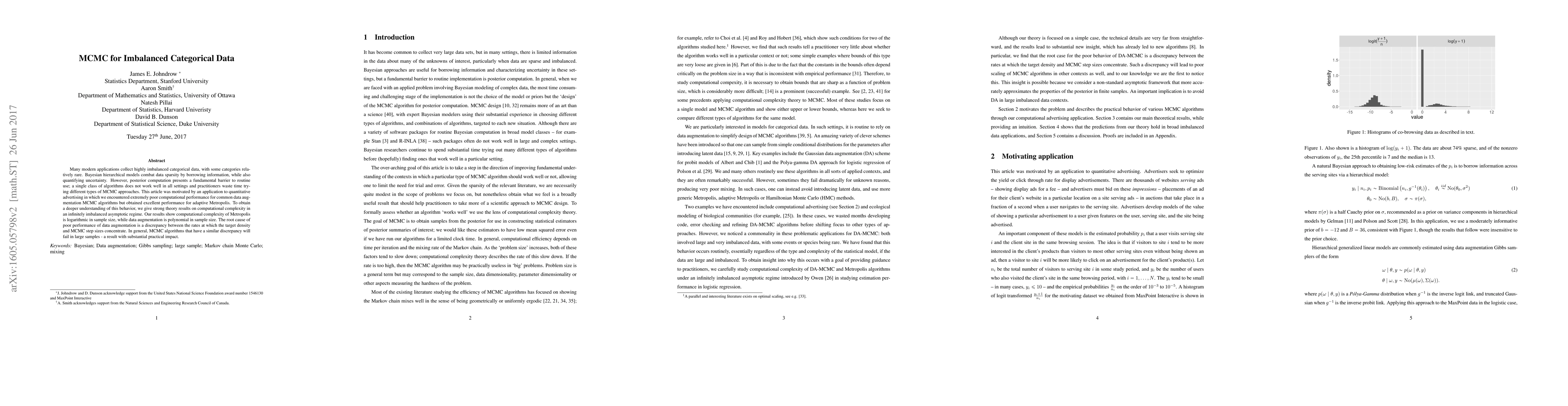 This paper investigates the computational performance of MCMC algorithms for imbalanced categorical data, finding that adaptive Metropolis outperforms common data augmentation methods. Theoretical results reveal that data augmentation's complexity is polynomial while adaptive Metropolis' is logarithmic, highlighting the importance of matching algorithm design to data characteristics.