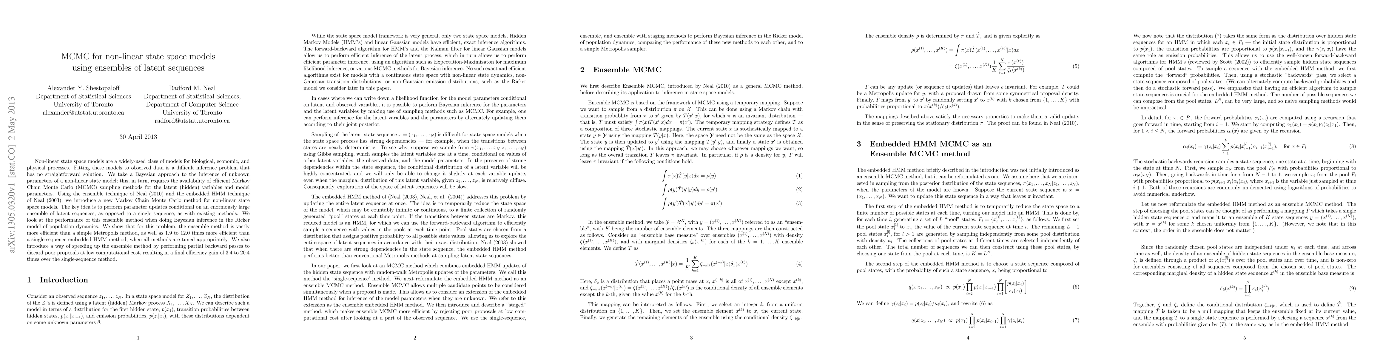 This paper proposes an ensemble-based Markov Chain Monte Carlo (MCMC) method for efficiently inferring parameters in non-linear state space models, demonstrating significant improvements over traditional methods through the use of large ensembles of latent sequences. The ensemble method shows substantial efficiency gains in Bayesian inference for the Ricker model of population dynamics.