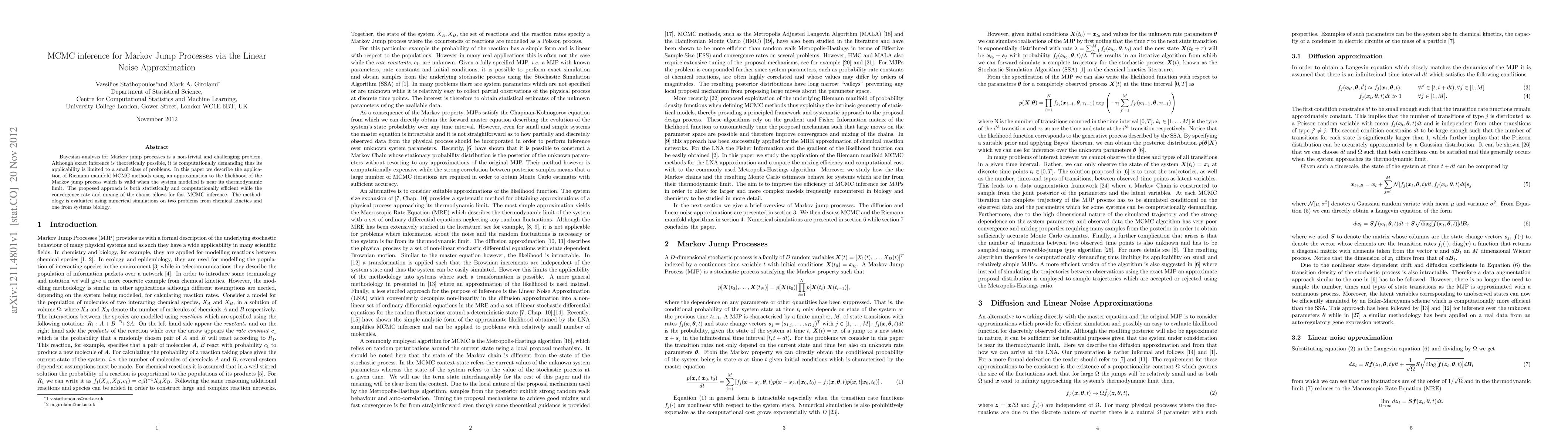 This paper proposes a Riemann manifold MCMC method for efficient Bayesian inference in Markov jump processes, utilizing a linear noise approximation valid near the thermodynamic limit. The approach is both statistically sound and computationally efficient, demonstrated through simulations in chemical kinetics and systems biology.