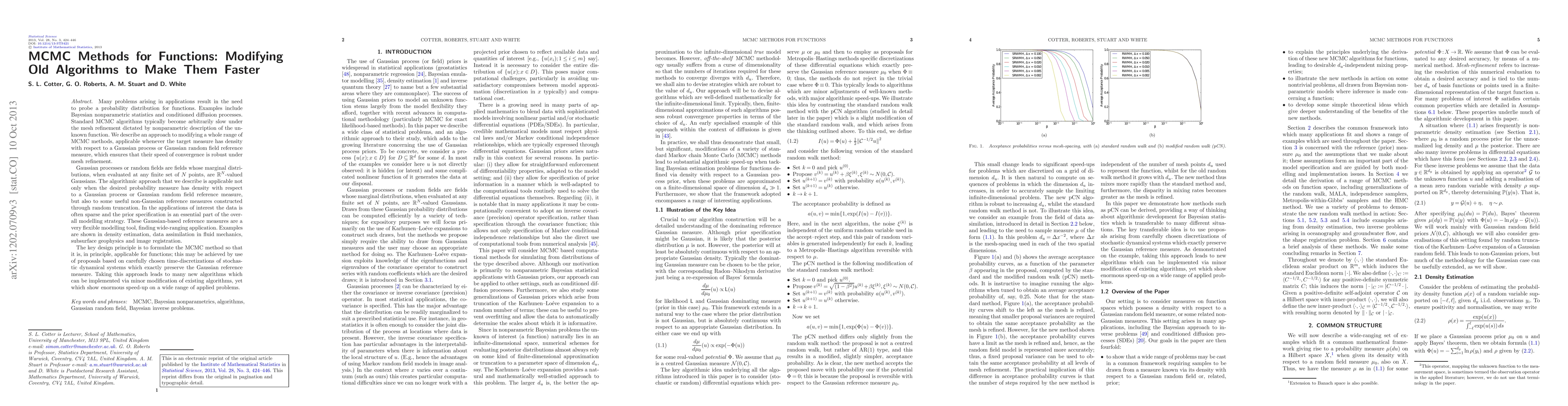 Many problems arising in applications result in the need to probe a probability distribution for functions. Examples include Bayesian nonparametric statistics and conditioned diffusion processes. Standard MCMC algorithms typically become arbitrarily slow under the mesh refinement dictated by nonparametric description of the unknown function. We describe an approach to modifying a whole range of MCMC methods, applicable whenever the target measure has density with respect to a Gaussian process or Gaussian random field reference measure, which ensures that their speed of convergence is robust under mesh refinement. Gaussian processes or random fields are fields whose marginal distributions, when evaluated at any finite set of $N$ points, are $\mathbb{R}^N$-valued Gaussians. The algorithmic approach that we describe is applicable not only when the desired probability measure has density with respect to a Gaussian process or Gaussian random field reference measure, but also to some useful non-Gaussian reference measures constructed through random truncation. In the applications of interest the data is often sparse and the prior specification is an essential part of the overall modelling strategy. These Gaussian-based reference measures are a very flexible modelling tool, finding wide-ranging application. Examples are shown in density estimation, data assimilation in fluid mechanics, subsurface geophysics and image registration. The key design principle is to formulate the MCMC method so that it is, in principle, applicable for functions; this may be achieved by use of proposals based on carefully chosen time-discretizations of stochastic dynamical systems which exactly preserve the Gaussian reference measure. Taking this approach leads to many new algorithms which can be implemented via minor modification of existing algorithms, yet which show enormous speed-up on a wide range of applied problems.