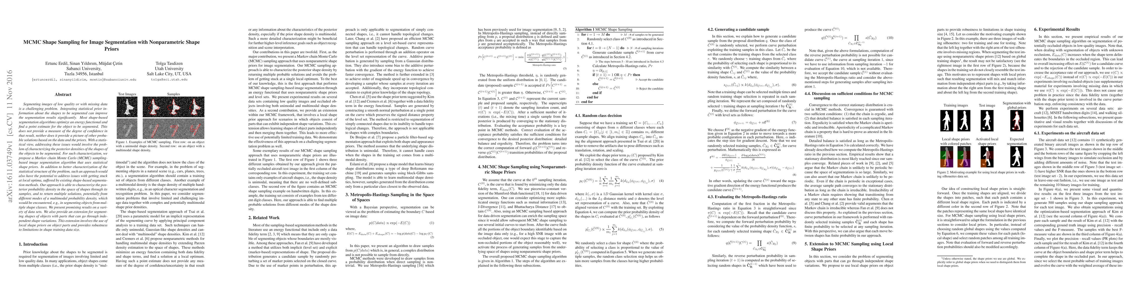 This paper proposes a Markov chain Monte Carlo (MCMC) sampling-based image segmentation algorithm that leverages nonparametric shape priors to improve segmentation results, especially for low-quality or incomplete images. The method provides a probabilistic characterization of shape posteriors, offering multiple segmentation solutions and addressing local optima issues.