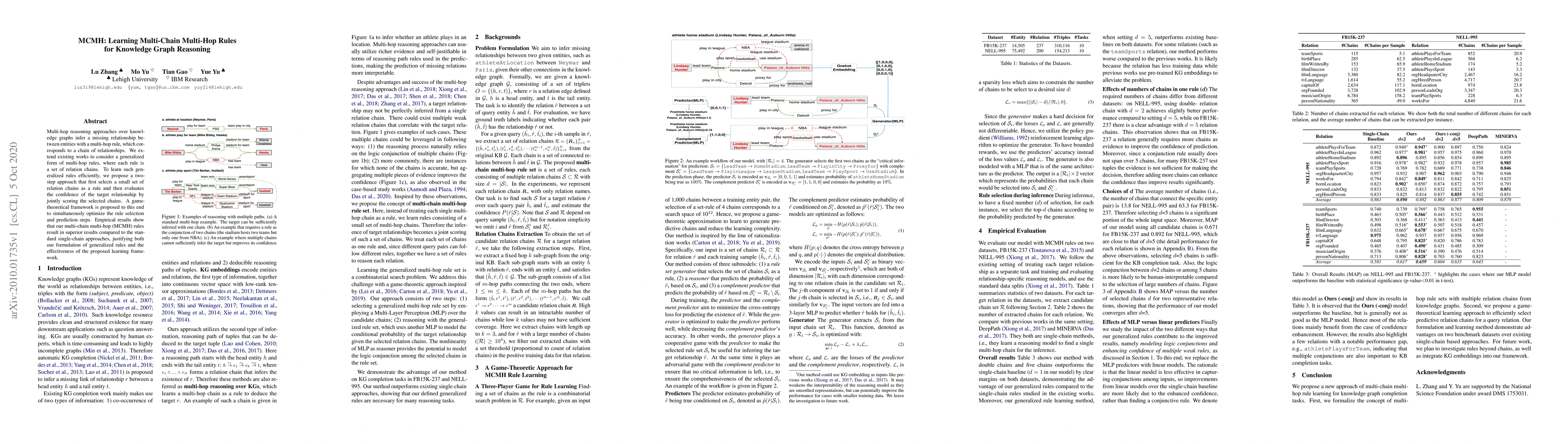 This paper proposes MCMH rules for multi-hop reasoning in knowledge graphs, which are sets of relation chains instead of single chains. It introduces a two-step learning approach and a game-theoretical framework to optimize rule selection and prediction, achieving better performance than single-chain approaches.