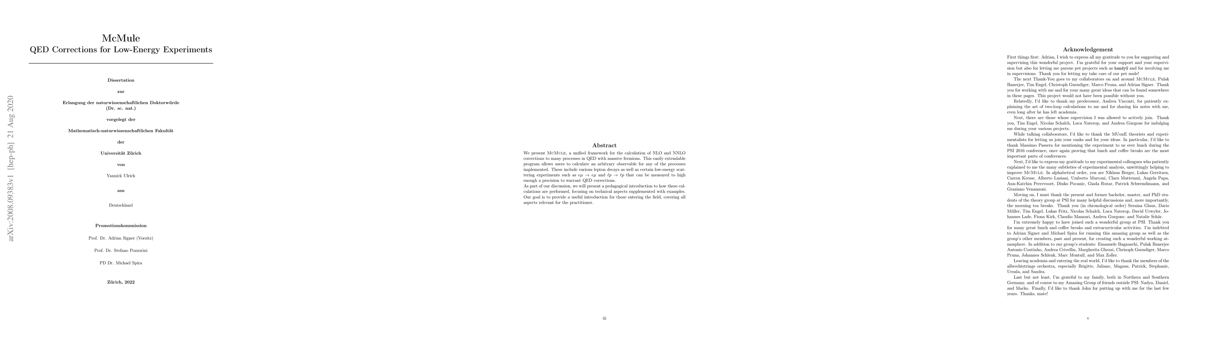 McMule is a versatile computational framework for calculating next-to-leading order (NLO) and next-to-next-to-leading order (NNLO) QED corrections for processes involving massive fermions, including lepton decays and low-energy scattering experiments. The paper also offers a pedagogical introduction to the technical aspects of these calculations, aimed at newcomers to the field.