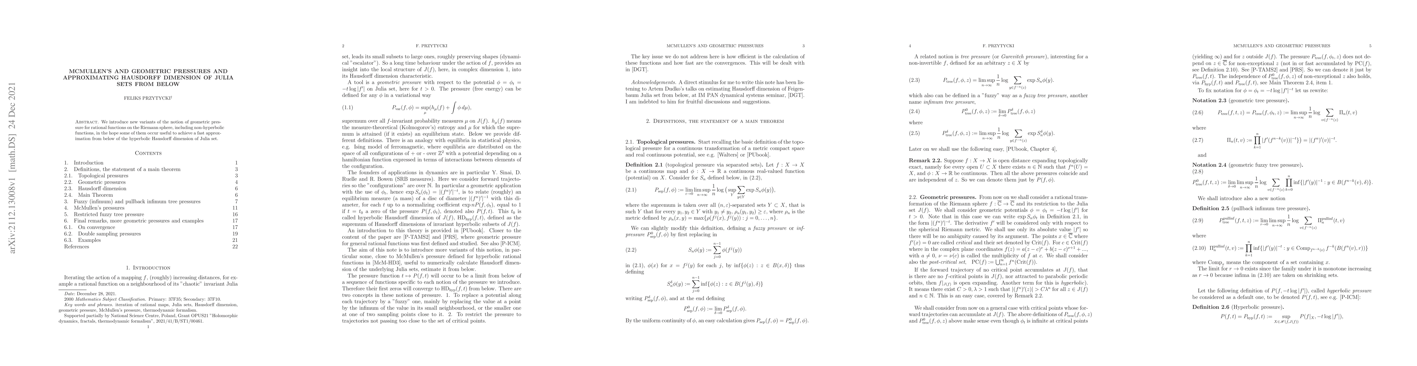We introduce new variants of the notion of geometric pressure for rational functions on the Riemann sphere, including non-hyperbolic functions, in the hope some of them occur useful to achieve a fast approximation from below of the hyperbolic Hausdorff dimension of Julia set.