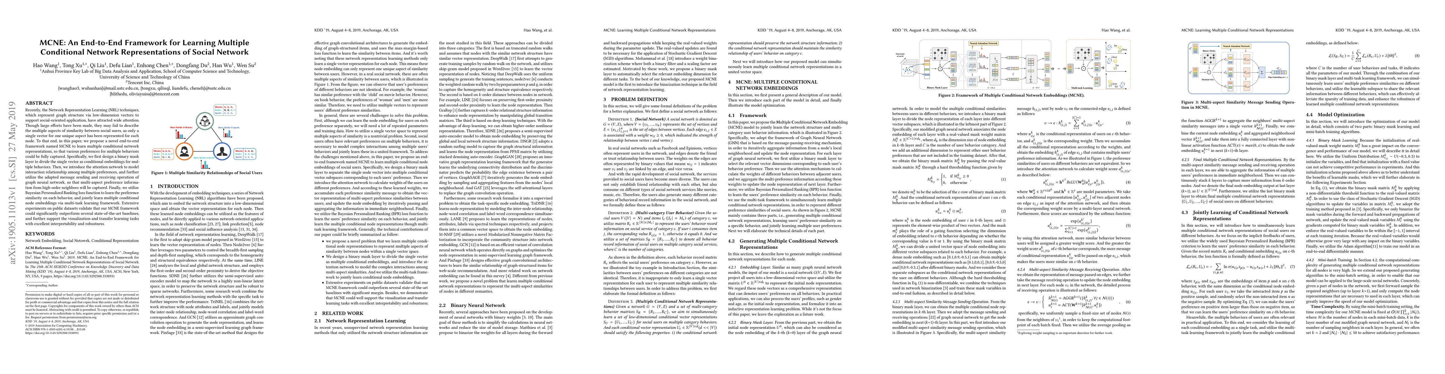 The paper proposes MCNE, an end-to-end framework for learning multiple conditional network representations of social networks, addressing the limitation of existing NRL techniques that represent only a single aspect of user similarity. MCNE leverages conditional embeddings, attention networks, and multi-task learning to capture multi-aspect preferences, outperforming state-of-the-art baselines in experiments.