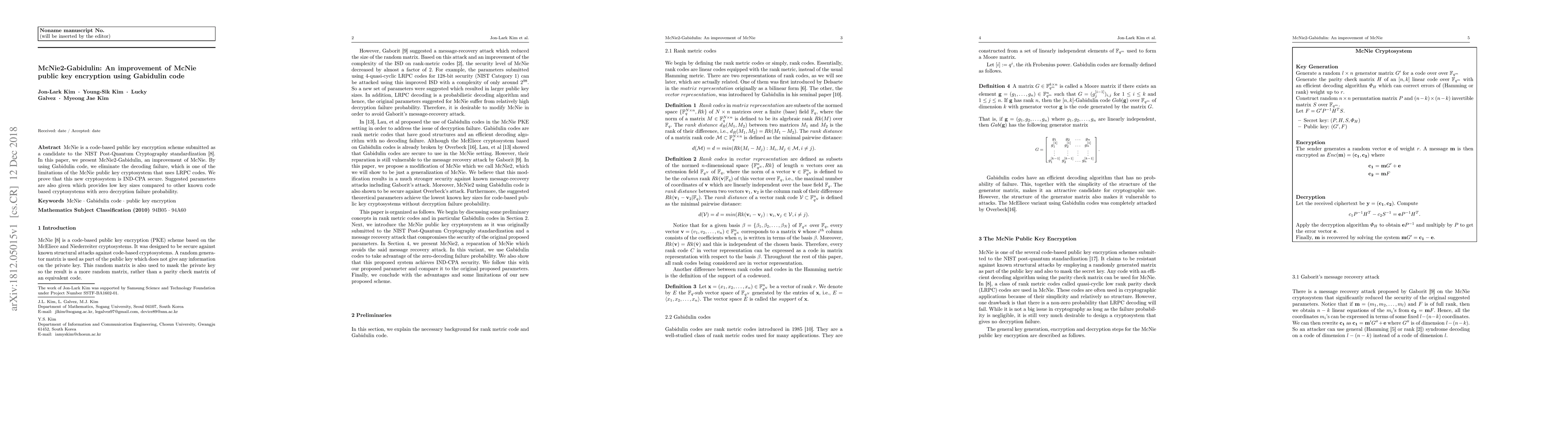 Summary: McNie2-Gabidulin enhances the McNie public key encryption scheme by incorporating Gabidulin codes to eliminate decoding failures, proving IND-CPA security, and offering smaller key sizes with zero decryption failure probability compared to other code-based cryptosystems.