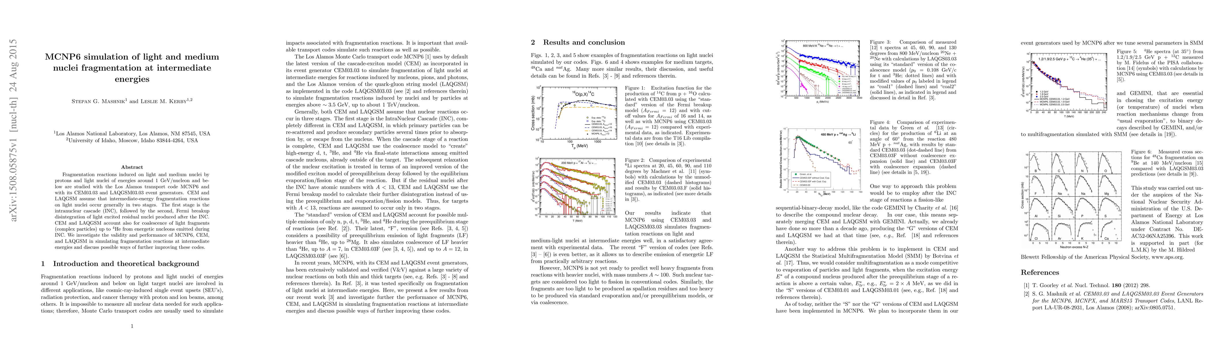 Fragmentation reactions induced on light and medium nuclei by protons and light nuclei of energies around 1 GeV/nucleon and below are studied with the Los Alamos transport code MCNP6 and with its CEM03.03 and LAQGSM03.03 event generators. CEM and LAQGSM assume that intermediate-energy fragmentation reactions on light nuclei occur generally in two stages. The first stage is the intranuclear cascade (INC), followed by the second, Fermi breakup disintegration of light excited residual nuclei produced after the INC. CEM and LAQGSM account also for coalescence of light fragments (complex particles) up to 4He from energetic nucleons emitted during INC. We investigate the validity and performance of MCNP6, CEM, and LAQGSM in simulating fragmentation reactions at intermediate energies and discuss possible ways of further improving these codes