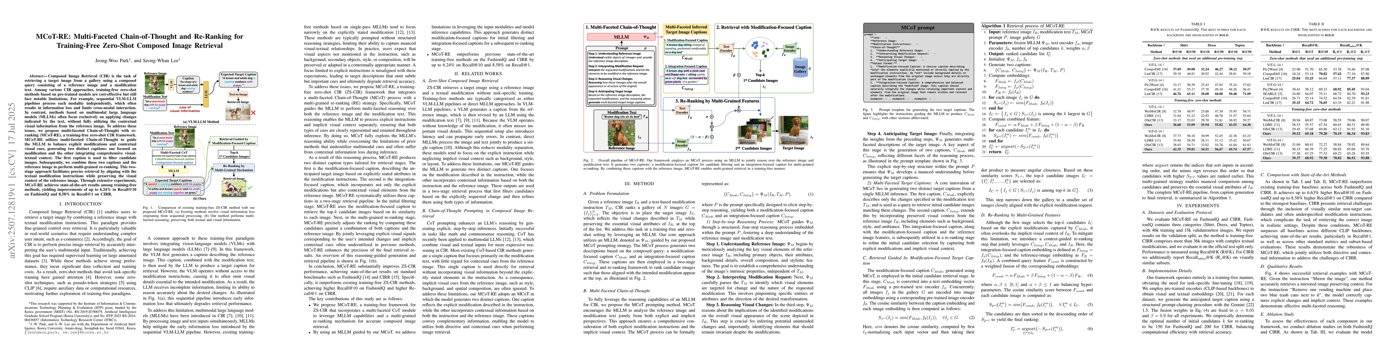 Composed Image Retrieval (CIR) is the task of retrieving a target image from a gallery using a composed query consisting of a reference image and a modification text. Among various CIR approaches, training-free zero-shot methods based on pre-trained models are cost-effective but still face notable limitations. For example, sequential VLM-LLM pipelines process each modality independently, which often results in information loss and limits cross-modal interaction. In contrast, methods based on multimodal large language models (MLLMs) often focus exclusively on applying changes indicated by the text, without fully utilizing the contextual visual information from the reference image. To address these issues, we propose multi-faceted Chain-of-Thought with re-ranking (MCoT-RE), a training-free zero-shot CIR framework. MCoT-RE utilizes multi-faceted Chain-of-Thought to guide the MLLM to balance explicit modifications and contextual visual cues, generating two distinct captions: one focused on modification and the other integrating comprehensive visual-textual context. The first caption is used to filter candidate images. Subsequently, we combine these two captions and the reference image to perform multi-grained re-ranking. This two-stage approach facilitates precise retrieval by aligning with the textual modification instructions while preserving the visual context of the reference image. Through extensive experiments, MCoT-RE achieves state-of-the-art results among training-free methods, yielding improvements of up to 6.24% in Recall@10 on FashionIQ and 8.58% in Recall@1 on CIRR.