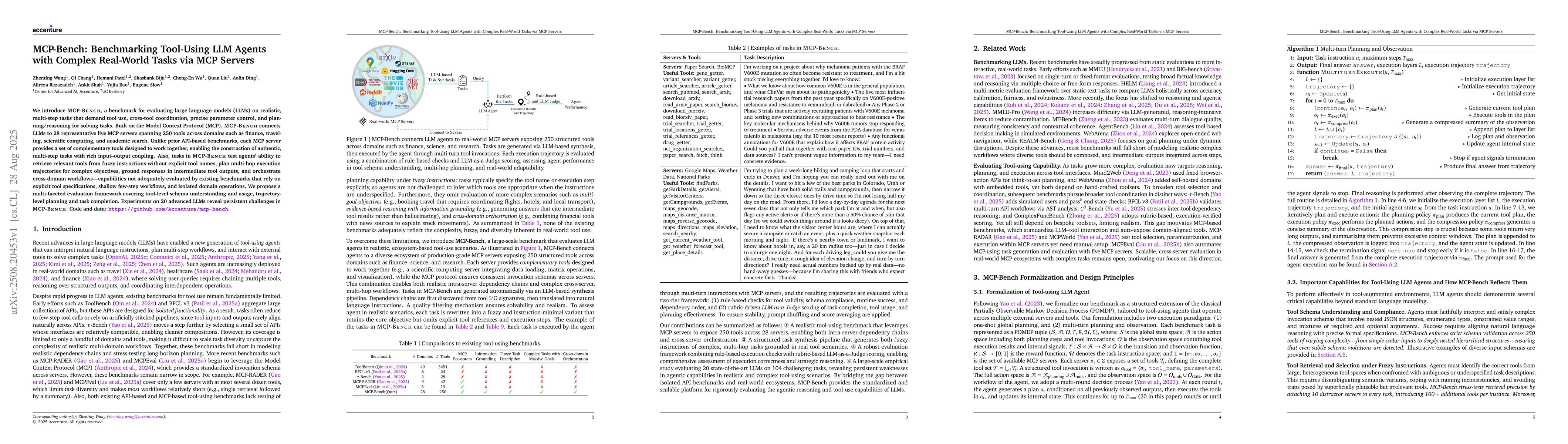 We introduce MCP-Bench, a benchmark for evaluating large language models (LLMs) on realistic, multi-step tasks that demand tool use, cross-tool coordination, precise parameter control, and planning/reasoning for solving tasks. Built on the Model Context Protocol (MCP), MCP-Bench connects LLMs to 28 representative live MCP servers spanning 250 tools across domains such as finance, traveling, scientific computing, and academic search. Unlike prior API-based benchmarks, each MCP server provides a set of complementary tools designed to work together, enabling the construction of authentic, multi-step tasks with rich input-output coupling. Tasks in MCP-Bench test agents' ability to retrieve relevant tools from fuzzy instructions without explicit tool names, plan multi-hop execution trajectories for complex objectives, ground responses in intermediate tool outputs, and orchestrate cross-domain workflows - capabilities not adequately evaluated by existing benchmarks that rely on explicit tool specifications, shallow few-step workflows, and isolated domain operations. We propose a multi-faceted evaluation framework covering tool-level schema understanding and usage, trajectory-level planning, and task completion. Experiments on 20 advanced LLMs reveal persistent challenges in MCP-Bench. Code and data: https://github.com/Accenture/mcp-bench.
