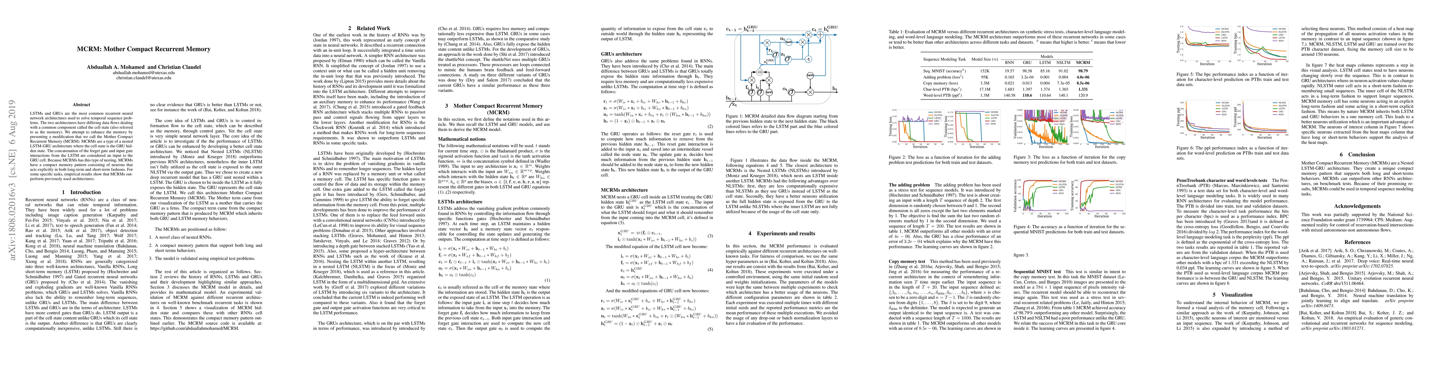 LSTMs and GRUs are the most common recurrent neural network architectures used to solve temporal sequence problems. The two architectures have differing data flows dealing with a common component called the cell state (also referred to as the memory). We attempt to enhance the memory by presenting a modification that we call the Mother Compact Recurrent Memory (MCRM). MCRMs are a type of a nested LSTM-GRU architecture where the cell state is the GRU hidden state. The concatenation of the forget gate and input gate interactions from the LSTM are considered an input to the GRU cell. Because MCRMs has this type of nesting, MCRMs have a compact memory pattern consisting of neurons that acts explicitly in both long-term and short-term fashions. For some specific tasks, empirical results show that MCRMs outperform previously used architectures.