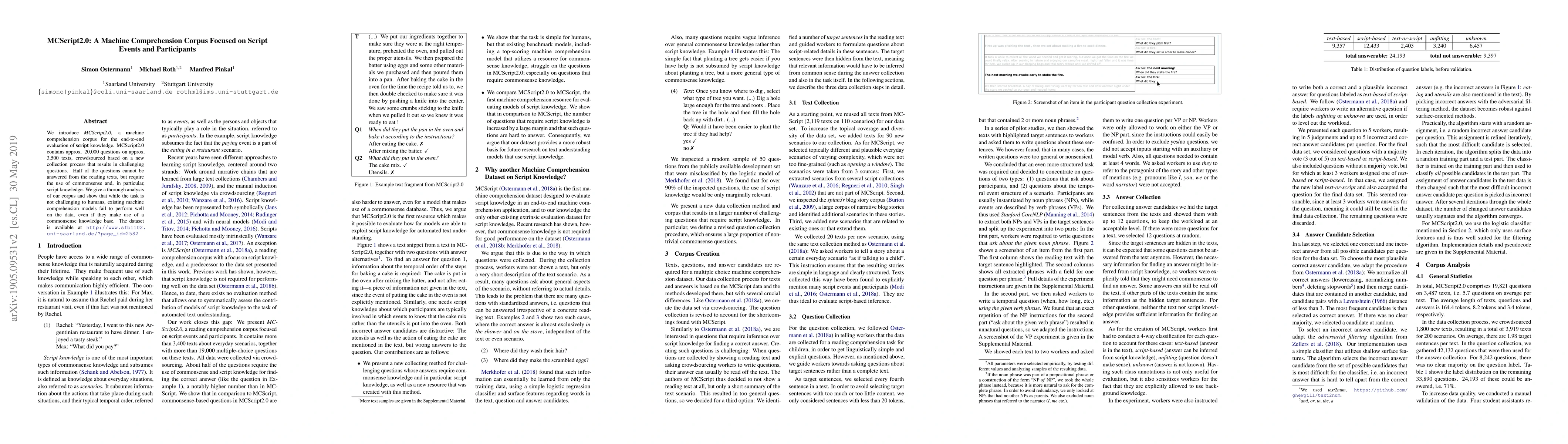 MCScript2.0 is a machine comprehension corpus designed to evaluate script knowledge through 20,000 questions on 3,500 texts, requiring commonsense and script understanding for answers. Existing models struggle despite using commonsense knowledge bases, highlighting the need for improved script event comprehension.