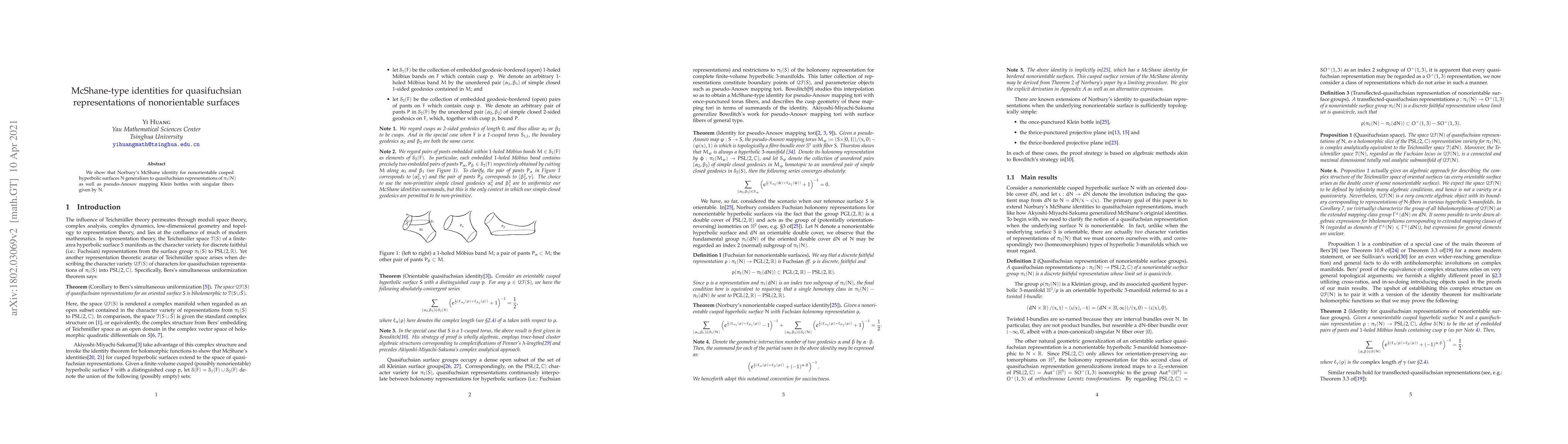 Researchers generalize Norbury's McShane identity to quasifuchsian representations of nonorientable surfaces, including pseudo-Anosov mapping Klein bottles with singular fibers.