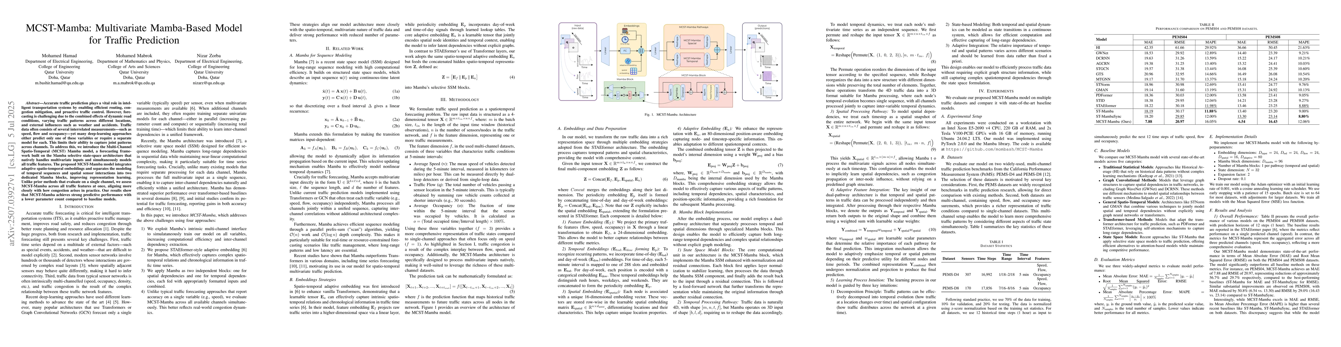 Accurate traffic prediction plays a vital role in intelligent transportation systems by enabling efficient routing, congestion mitigation, and proactive traffic control. However, forecasting is challenging due to the combined effects of dynamic road conditions, varying traffic patterns across different locations, and external influences such as weather and accidents. Traffic data often consists of several interrelated measurements - such as speed, flow and occupancy - yet many deep-learning approaches either predict only one of these variables or require a separate model for each. This limits their ability to capture joint patterns across channels. To address this, we introduce the Multi-Channel Spatio-Temporal (MCST) Mamba model, a forecasting framework built on the Mamba selective state-space architecture that natively handles multivariate inputs and simultaneously models all traffic features. The proposed MCST-Mamba model integrates adaptive spatio-temporal embeddings and separates the modeling of temporal sequences and spatial sensor interactions into two dedicated Mamba blocks, improving representation learning. Unlike prior methods that evaluate on a single channel, we assess MCST-Mamba across all traffic features at once, aligning more closely with how congestion arises in practice. Our results show that MCST-Mamba achieves strong predictive performance with a lower parameter count compared to baseline models.