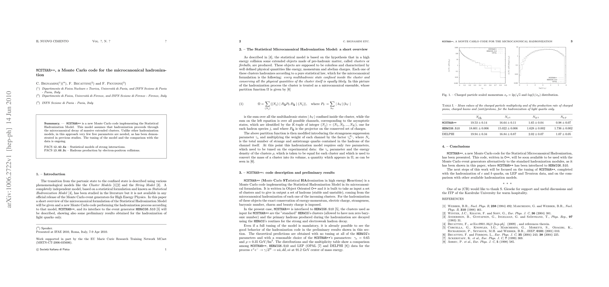 MCSTHAR++ is a Monte Carlo code for the Statistical Hadronization Model, requiring few parameters and simulating microcanonical decay of clusters. Ongoing tuning and data comparison are underway to validate the model.