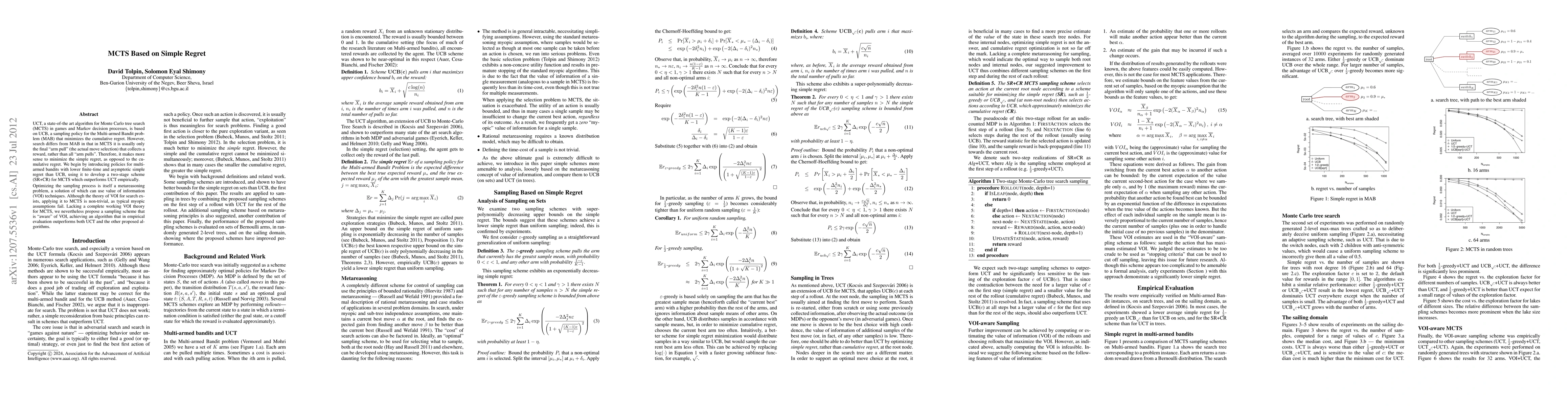 UCT, a state-of-the art algorithm for Monte Carlo tree search (MCTS) in games and Markov decision processes, is based on UCB, a sampling policy for the Multi-armed Bandit problem (MAB) that minimizes the cumulative regret. However, search differs from MAB in that in MCTS it is usually only the final "arm pull" (the actual move selection) that collects a reward, rather than all "arm pulls". Therefore, it makes more sense to minimize the simple regret, as opposed to the cumulative regret. We begin by introducing policies for multi-armed bandits with lower finite-time and asymptotic simple regret than UCB, using it to develop a two-stage scheme (SR+CR) for MCTS which outperforms UCT empirically. Optimizing the sampling process is itself a metareasoning problem, a solution of which can use value of information (VOI) techniques. Although the theory of VOI for search exists, applying it to MCTS is non-trivial, as typical myopic assumptions fail. Lacking a complete working VOI theory for MCTS, we nevertheless propose a sampling scheme that is "aware" of VOI, achieving an algorithm that in empirical evaluation outperforms both UCT and the other proposed algorithms.