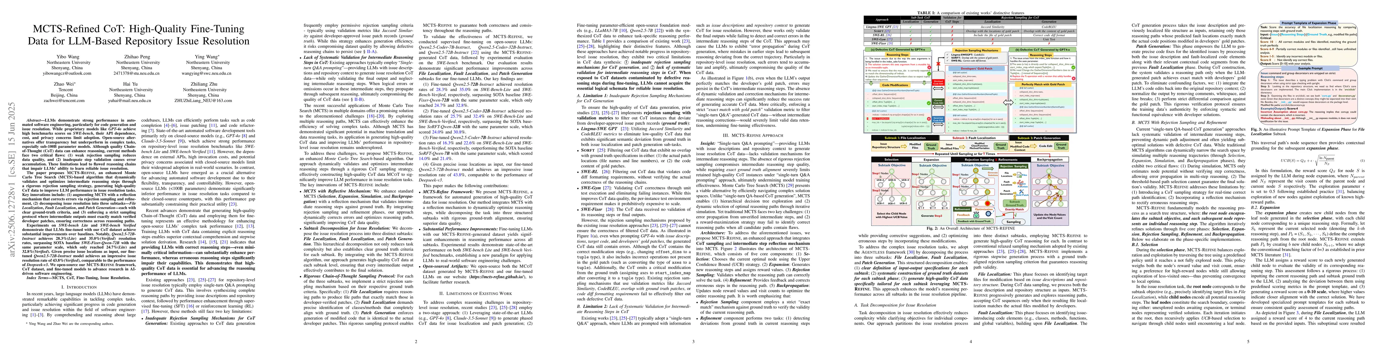 LLMs demonstrate strong performance in auto-mated software engineering, particularly for code generation and issue resolution. While proprietary models like GPT-4o achieve high benchmarks scores on SWE-bench, their API dependence, cost, and privacy concerns limit adoption. Open-source alternatives offer transparency but underperform in complex tasks, especially sub-100B parameter models. Although quality Chain-of-Thought (CoT) data can enhance reasoning, current methods face two critical flaws: (1) weak rejection sampling reduces data quality, and (2) inadequate step validation causes error accumulation. These limitations lead to flawed reasoning chains that impair LLMs'ability to learn reliable issue resolution. The paper proposes MCTS-REFINE, an enhanced Monte Carlo Tree Search (MCTS)-based algorithm that dynamically validates and optimizes intermediate reasoning steps through a rigorous rejection sampling strategy, generating high-quality CoT data to improve LLM performance in issue resolution tasks. Key innovations include: (1) augmenting MCTS with a reflection mechanism that corrects errors via rejection sampling and refinement, (2) decomposing issue resolution into three subtasks-File Localization, Fault Localization, and Patch Generation-each with clear ground-truth criteria, and (3) enforcing a strict sampling protocol where intermediate outputs must exactly match verified developer patches, ensuring correctness across reasoning paths. Experiments on SWE-bench Lite and SWE-bench Verified demonstrate that LLMs fine-tuned with our CoT dataset achieve substantial improvements over baselines.Notably, Qwen2.5-72B- Instruct achieves 28.3%(Lite) and 35.0%(Verified) resolution rates, surpassing SOTA baseline SWE-Fixer-Qwen-72B with the same parameter scale, which only reached 24.7%(Lite) and 32.8%(Verified).