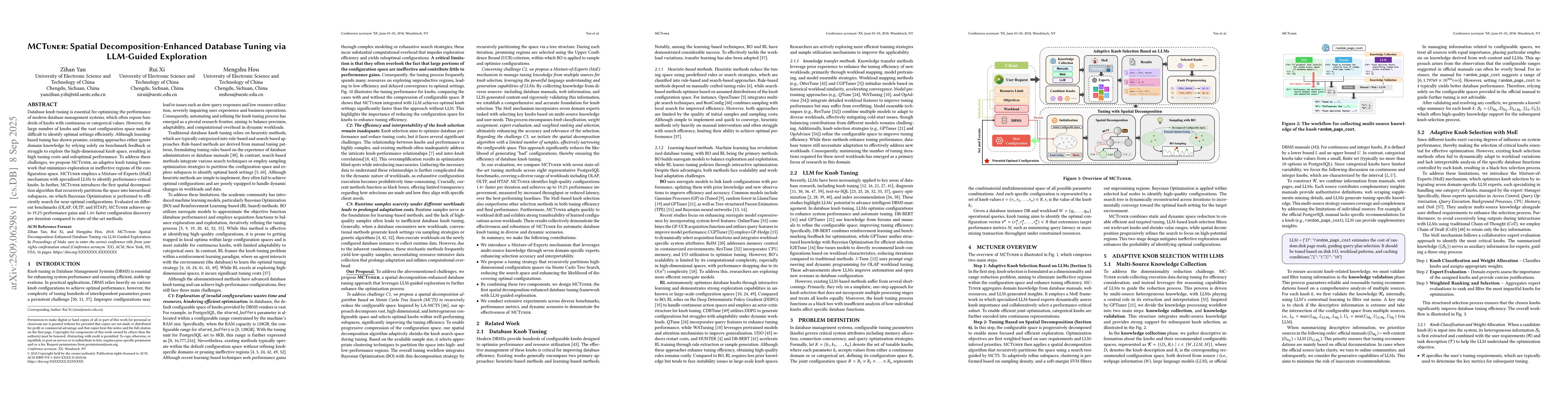 Database knob tuning is essential for optimizing the performance of modern database management systems, which often expose hundreds of knobs with continuous or categorical values. However, the large number of knobs and the vast configuration space make it difficult to identify optimal settings efficiently. Although learning-based tuning has shown promise, existing approaches either ignore domain knowledge by relying solely on benchmark feedback or struggle to explore the high-dimensional knob space, resulting in high tuning costs and suboptimal performance. To address these challenges, we propose MCTuner, an adaptive knob tuning framework that minimizes exploration in ineffective regions of the configuration space. MCTuner employs a Mixture-of-Experts (MoE) mechanism with specialized LLMs to identify performance-critical knobs. In further, MCTuner introduces the first spatial decomposition algorithm that recursively partitions the space into hierarchical subspaces, on which Bayesian Optimization is performed to efficiently search for near-optimal configurations. Evaluated on different benchmarks (OLAP, OLTP, and HTAP), MCTuner achieves up to 19.2% performance gains and 1.4x faster configuration discovery per iteration compared to state-of-the-art methods.