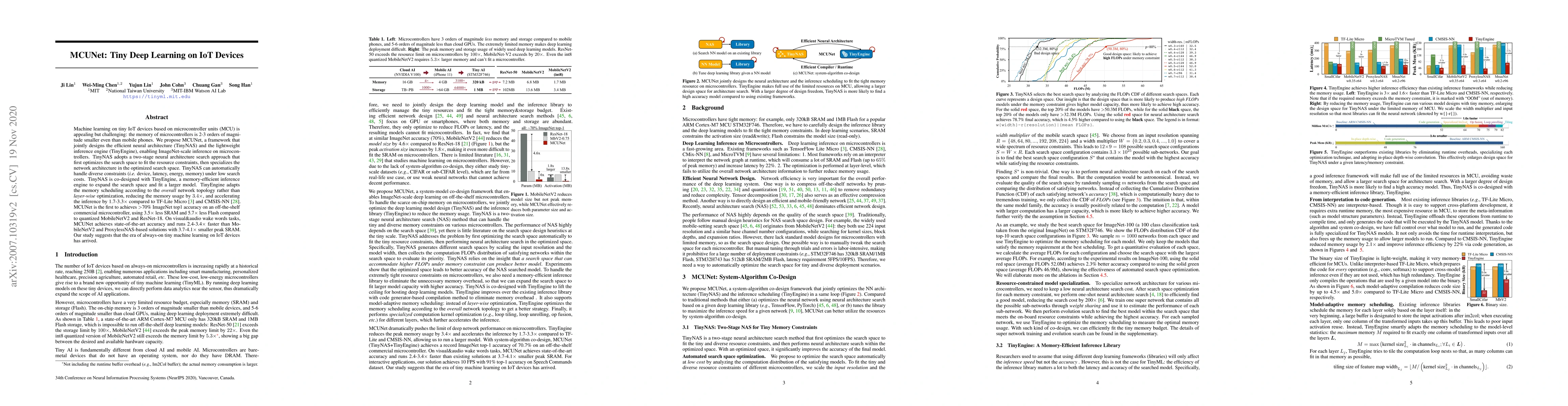 MCUNet proposes TinyNAS and TinyEngine to enable efficient deep learning on resource-constrained IoT devices, achieving >70% ImageNet top1 accuracy with significantly reduced memory and energy usage, and state-of-the-art performance on wake word tasks.