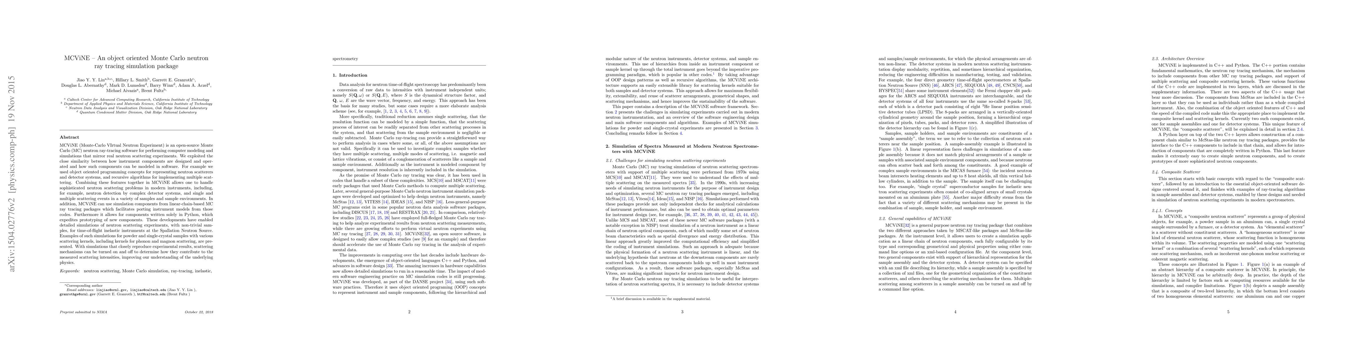 MCViNE is an object-oriented Monte Carlo neutron ray-tracing simulation package that employs modern software engineering techniques to model complex neutron scattering experiments. It facilitates detailed simulations of neutron scattering, aiding in the understanding of scattering mechanisms and their contributions.