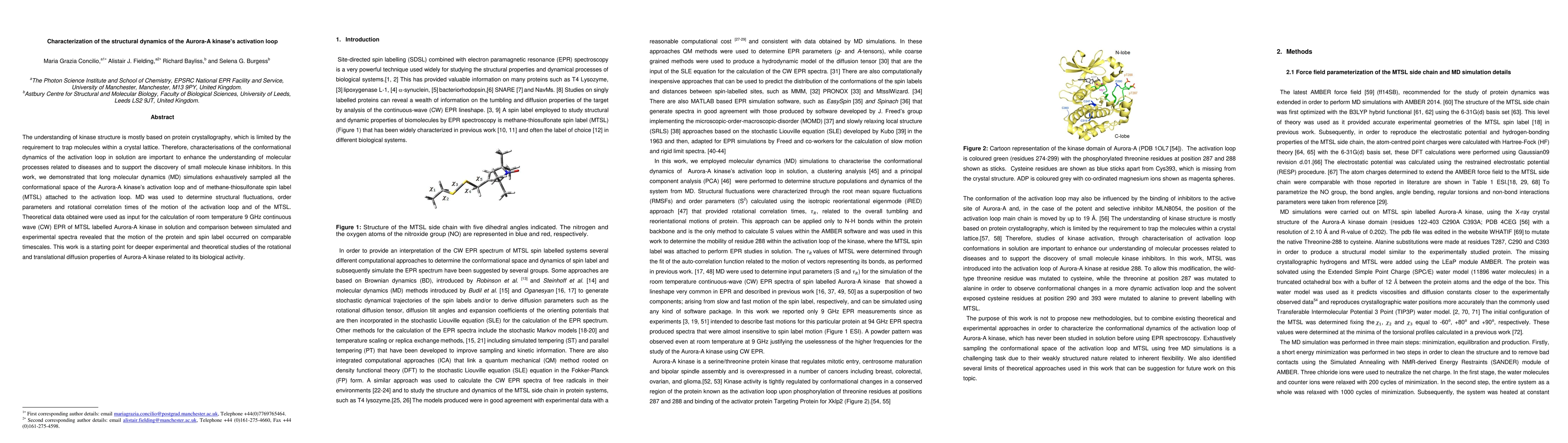 This study uses MD simulations and EPR spectroscopy to characterize the conformational dynamics of Aurora-A kinase's activation loop, revealing that the protein and spin label's motion occurs on comparable timescales. This provides a foundation for further exploration of the kinase's diffusion properties and its biological function.