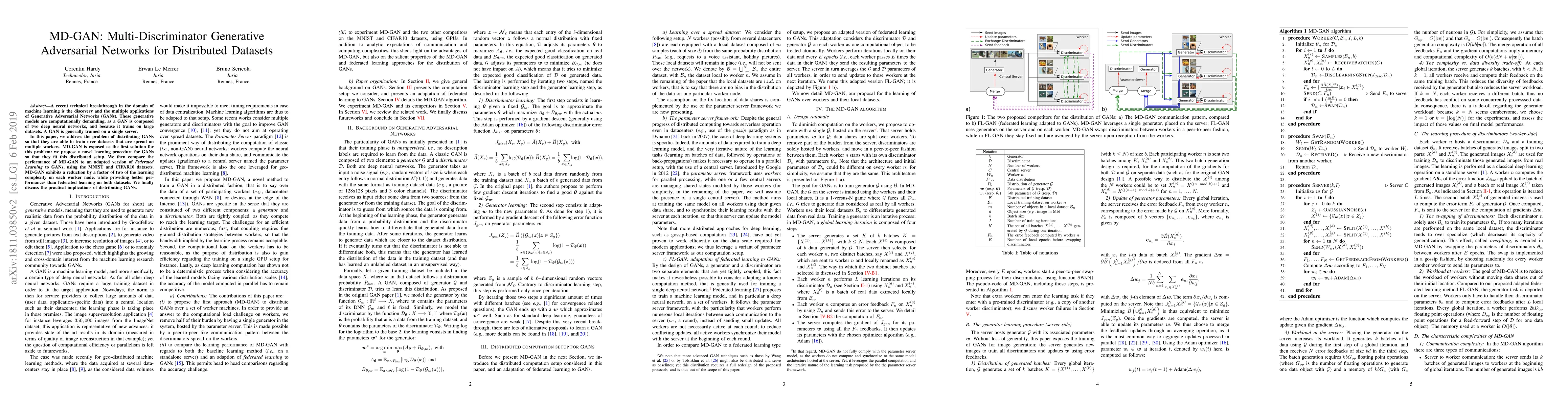 MD-GAN introduces a novel learning procedure for training Generative Adversarial Networks (GANs) across distributed datasets. It demonstrates a significant reduction in learning complexity and outperforms federated learning on MNIST and CIFAR10 datasets.