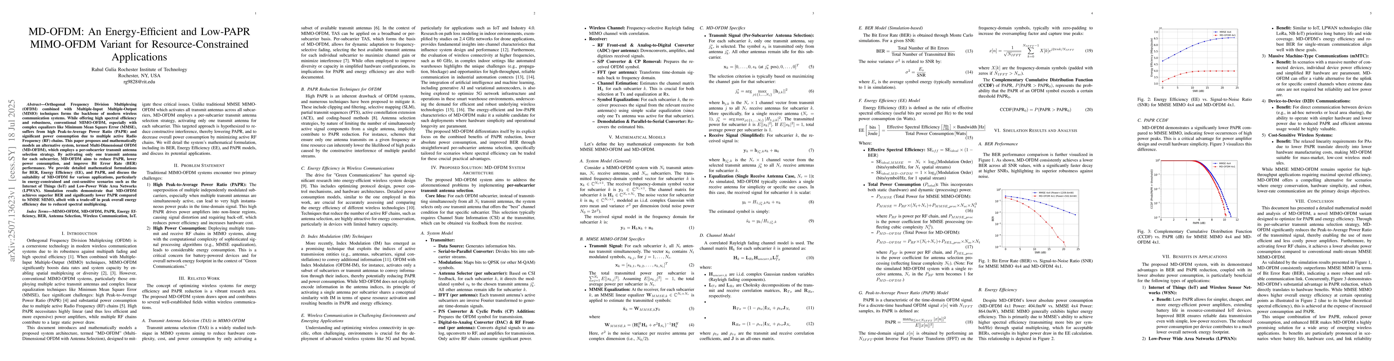 Orthogonal Frequency Division Multiplexing (OFDM) combined with Multiple-Input Multiple-Output (MIMO) techniques forms the backbone of modern wireless communication systems. While offering high spectral efficiency and robustness, conventional MIMO-OFDM, especially with complex equalizers like Minimum Mean Square Error (MMSE), suffers from high Peak-to-Average Power Ratio (PAPR) and significant power consumption due to multiple active Radio Frequency (RF) chains. This paper proposes and mathematically models an alternative system, termed Multi-Dimensional OFDM (MD-OFDM), which employs a per-subcarrier transmit antenna selection strategy. By activating only one transmit antenna for each subcarrier, MD-OFDM aims to reduce PAPR, lower power consumption, and improve Bit Error Rate (BER) performance. We provide detailed mathematical formulations for BER, Energy Efficiency (EE), and PAPR, and discuss the suitability of MD-OFDM for various applications, particularly in energy-constrained and cost-sensitive scenarios such as the Internet of Things (IoT) and Low-Power Wide Area Networks (LPWAN). Simulation results demonstrate that MD-OFDM achieves superior BER and significantly lower PAPR compared to MMSE MIMO, albeit with a trade-off in peak overall energy efficiency due to reduced spectral multiplexing.