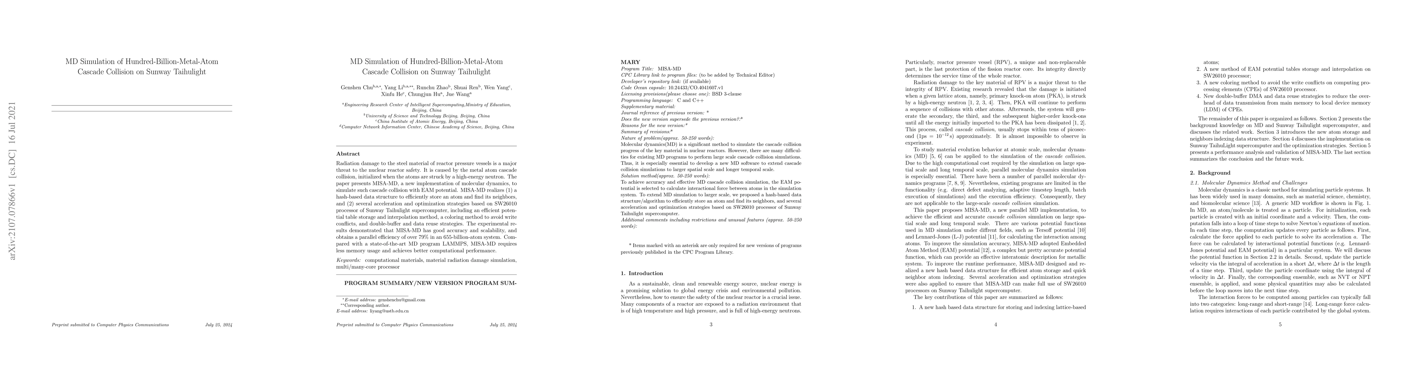 This paper presents MISA-MD, a new molecular dynamics simulation tool for modeling radiation damage in reactor pressure vessels, utilizing the Sunway Taihulight supercomputer. It achieves high efficiency and scalability through optimized data structures and parallel processing techniques, demonstrating over 79% parallel efficiency and better performance than LAMMPS.