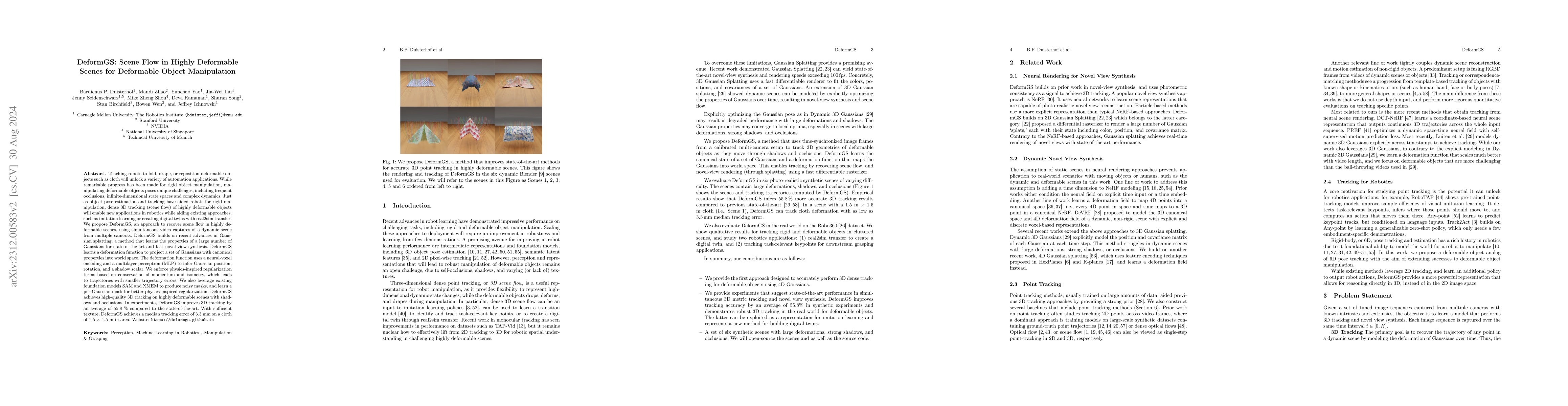 MD-Splatting introduces a method for accurate 3D tracking and novel view synthesis in highly deformable scenes, leveraging 4D Gaussians and a deformation function to handle occlusions and shadows. It achieves a 23.9% improvement in 3D tracking accuracy compared to state-of-the-art methods.