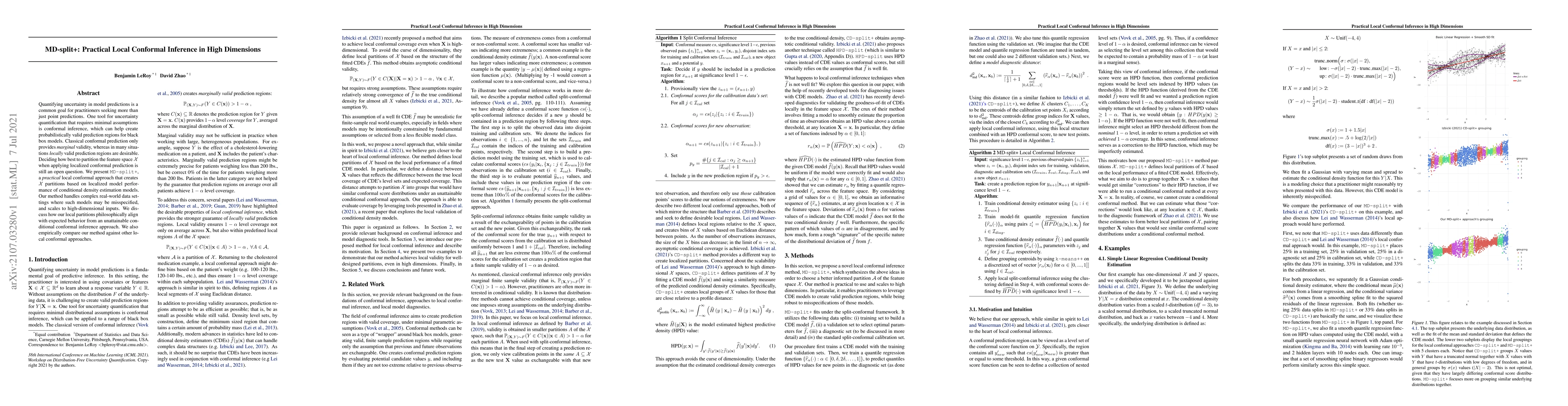 Quantifying uncertainty in model predictions is a common goal for practitioners seeking more than just point predictions. One tool for uncertainty quantification that requires minimal assumptions is conformal inference, which can help create probabilistically valid prediction regions for black box models. Classical conformal prediction only provides marginal validity, whereas in many situations locally valid prediction regions are desirable. Deciding how best to partition the feature space X when applying localized conformal prediction is still an open question. We present MD-split+, a practical local conformal approach that creates X partitions based on localized model performance of conditional density estimation models. Our method handles complex real-world data settings where such models may be misspecified, and scales to high-dimensional inputs. We discuss how our local partitions philosophically align with expected behavior from an unattainable conditional conformal inference approach. We also empirically compare our method against other local conformal approaches.