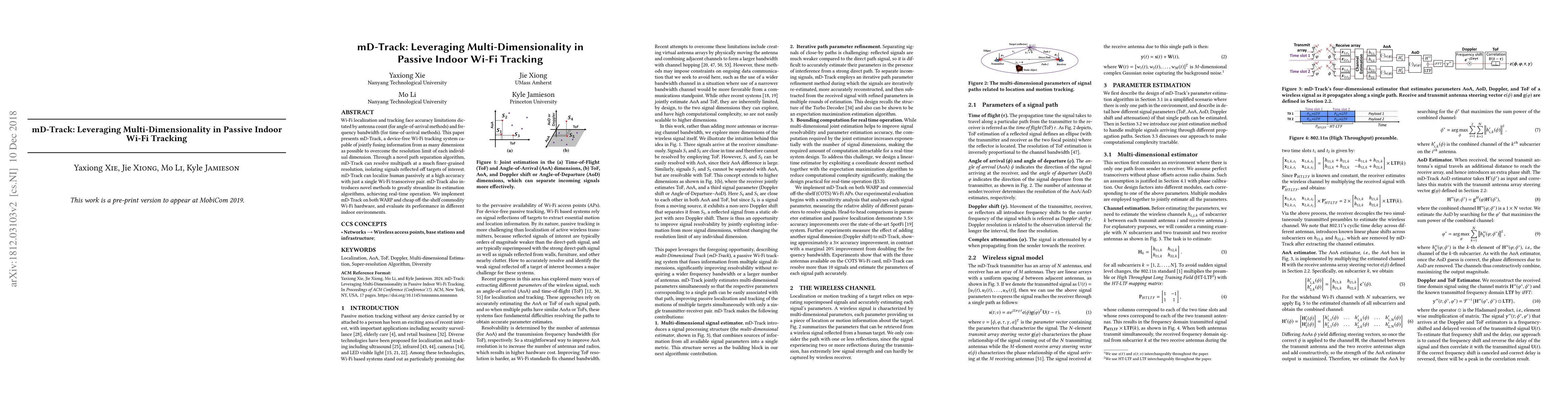mD-Track is a device-free Wi-Fi tracking system that leverages multi-dimensional data to enhance indoor localization accuracy, overcoming limitations of traditional methods. It employs a novel path separation algorithm to isolate signals reflected off targets, achieving high-precision passive human localization with a single Wi-Fi transceiver pair.