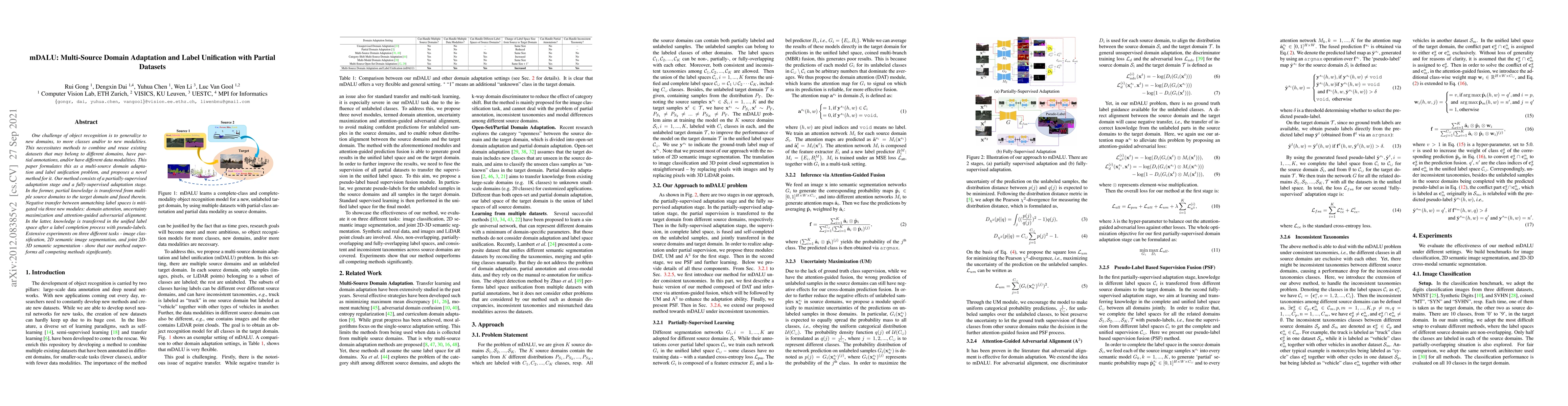 This paper proposes mDALU, a method for multi-source domain adaptation and label unification using partial datasets. It combines partially-supervised and fully-supervised adaptation stages, employing domain attention, uncertainty maximization, and adversarial alignment to mitigate negative transfer. Experiments show significant improvements over competing methods in image classification, 2D semantic segmentation, and joint 2D-3D semantic segmentation.