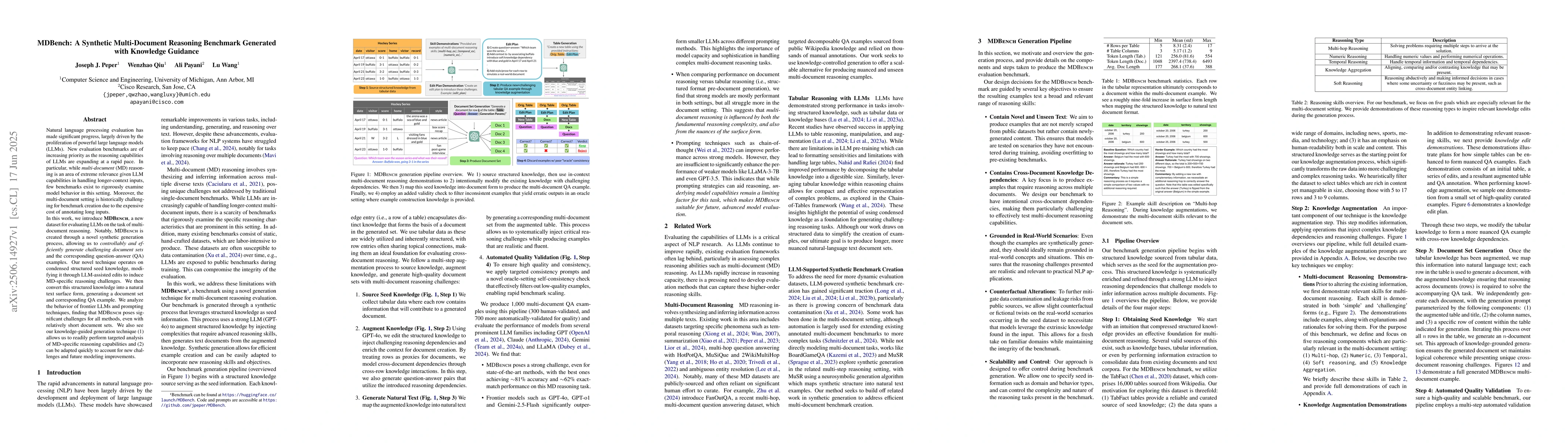Natural language processing evaluation has made significant progress, largely driven by the proliferation of powerful large language mod-els (LLMs). New evaluation benchmarks are of increasing priority as the reasoning capabilities of LLMs are expanding at a rapid pace. In particular, while multi-document (MD) reasoning is an area of extreme relevance given LLM capabilities in handling longer-context inputs, few benchmarks exist to rigorously examine model behavior in this setting. Moreover, the multi-document setting is historically challenging for benchmark creation due to the expensive cost of annotating long inputs. In this work, we introduce MDBench, a new dataset for evaluating LLMs on the task of multi-document reasoning. Notably, MDBench is created through a novel synthetic generation process, allowing us to controllably and efficiently generate challenging document sets and the corresponding question-answer (QA) examples. Our novel technique operates on condensed structured seed knowledge, modifying it through LLM-assisted edits to induce MD-specific reasoning challenges. We then convert this structured knowledge into a natural text surface form, generating a document set and corresponding QA example. We analyze the behavior of popular LLMs and prompting techniques, finding that MDBENCH poses significant challenges for all methods, even with relatively short document sets. We also see our knowledge-guided generation technique (1) allows us to readily perform targeted analysis of MD-specific reasoning capabilities and (2) can be adapted quickly to account for new challenges and future modeling improvements.