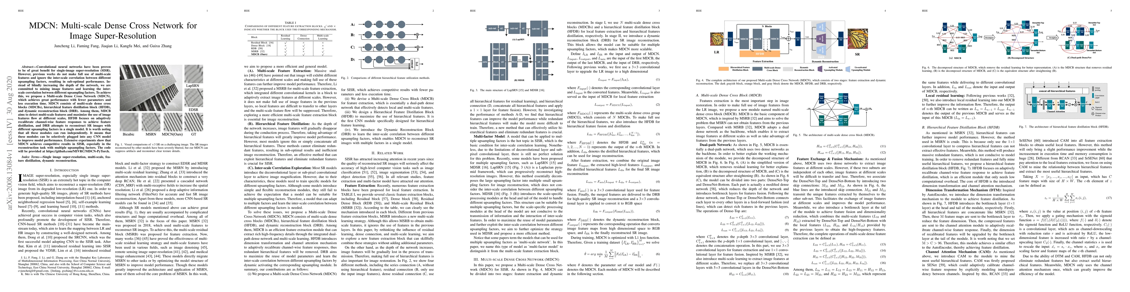 The paper proposes the Multi-scale Dense Cross Network (MDCN) for single-image super-resolution (SISR), which utilizes multi-scale dense cross blocks, hierarchical feature distillation, and dynamic reconstruction to enhance performance with fewer parameters. Extensive experiments demonstrate MDCN's competitive results, especially in tasks involving multiple upsampling factors.