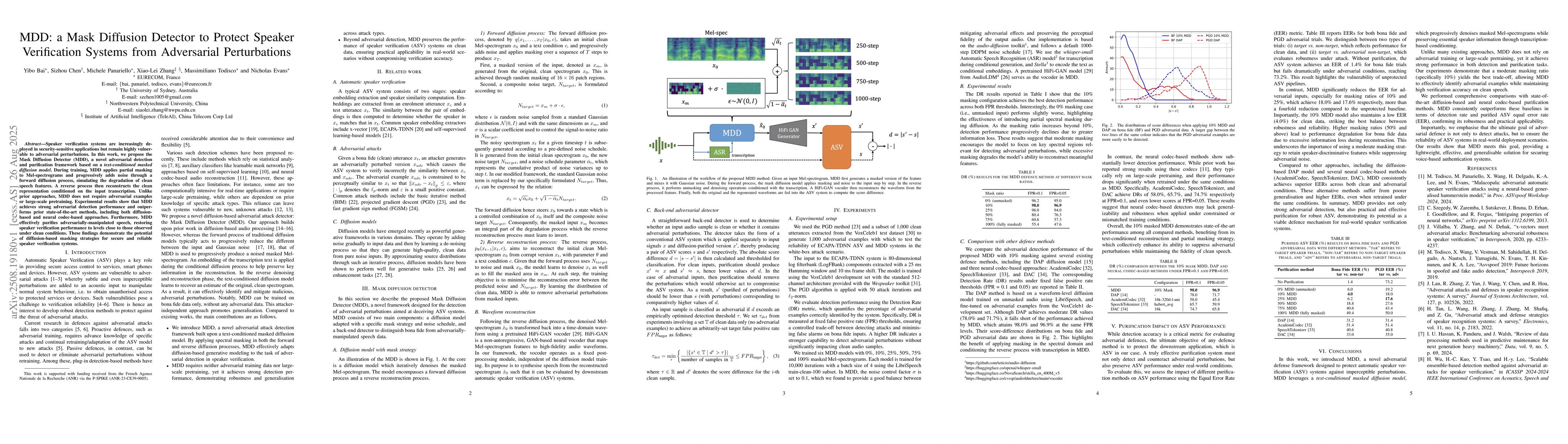 Speaker verification systems are increasingly deployed in security-sensitive applications but remain highly vulnerable to adversarial perturbations. In this work, we propose the Mask Diffusion Detector (MDD), a novel adversarial detection and purification framework based on a \textit{text-conditioned masked diffusion model}. During training, MDD applies partial masking to Mel-spectrograms and progressively adds noise through a forward diffusion process, simulating the degradation of clean speech features. A reverse process then reconstructs the clean representation conditioned on the input transcription. Unlike prior approaches, MDD does not require adversarial examples or large-scale pretraining. Experimental results show that MDD achieves strong adversarial detection performance and outperforms prior state-of-the-art methods, including both diffusion-based and neural codec-based approaches. Furthermore, MDD effectively purifies adversarially-manipulated speech, restoring speaker verification performance to levels close to those observed under clean conditions. These findings demonstrate the potential of diffusion-based masking strategies for secure and reliable speaker verification systems.