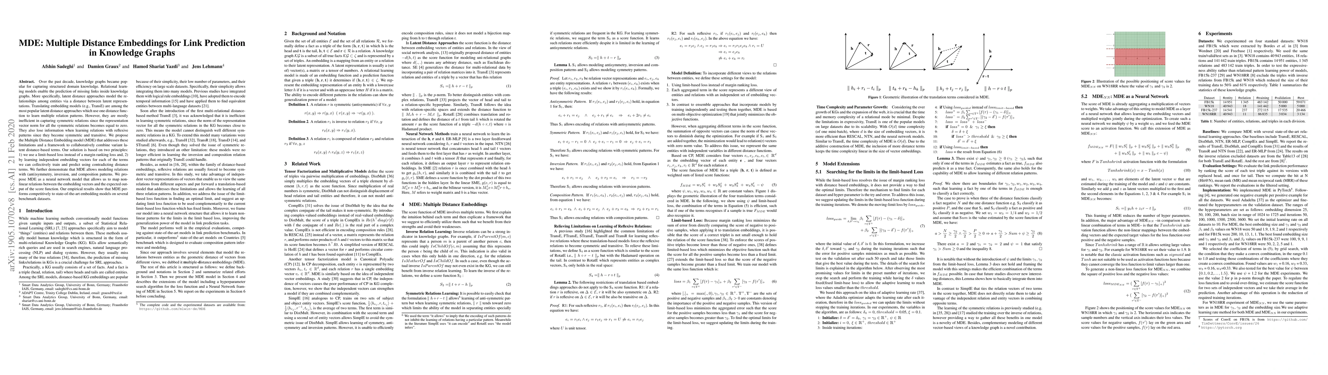 The paper proposes the Multiple Distance Embedding (MDE) model to improve link prediction in knowledge graphs by addressing limitations of existing embedding models. It uses a limit-based loss and independent embedding vectors for different distance terms to model complex relation patterns, achieving competitive performance on benchmark datasets.