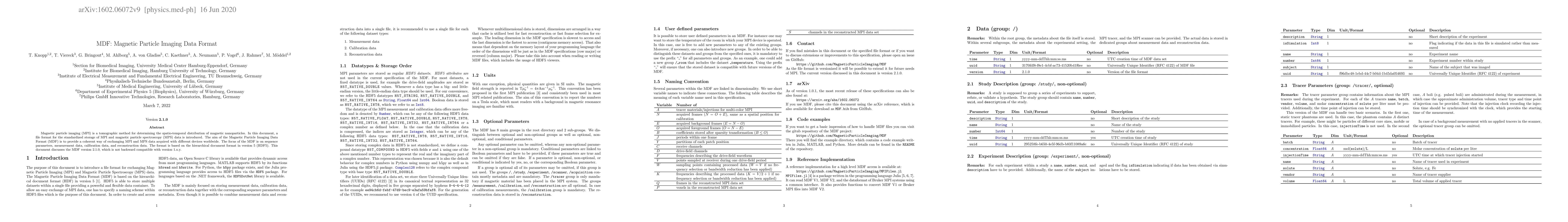 The MDF is a file format for standardized storage of magnetic particle imaging (MPI) and magnetic particle spectroscopy (MPS) data, based on HDF5. It aims to facilitate global data exchange and includes sequence, measurement, calibration, and reconstruction data, with version 2.1.0 being non-backward compatible with earlier versions.