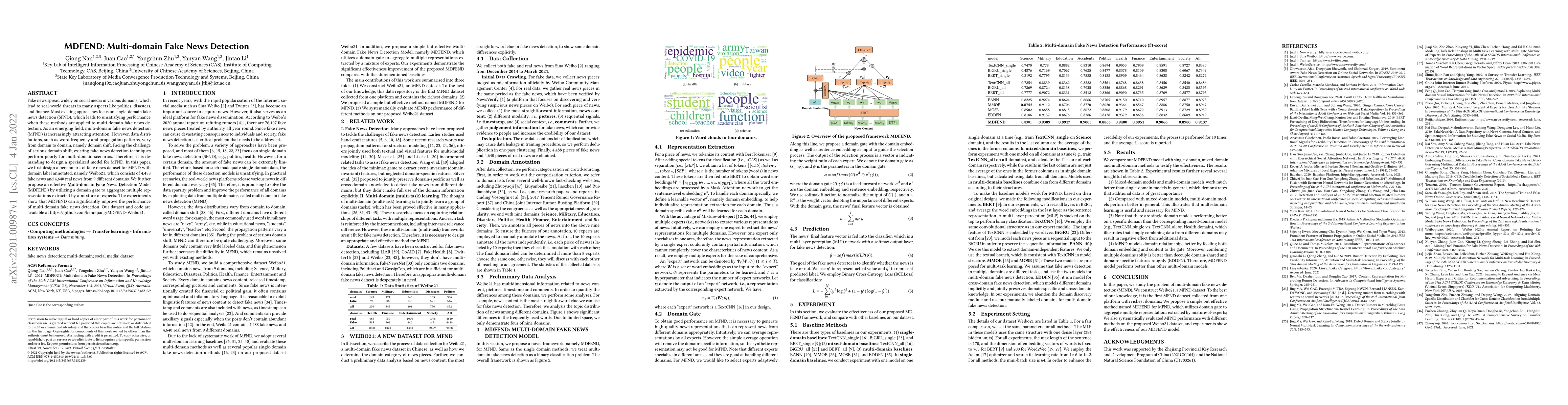 This paper introduces MDFEND, a specialized model for multi-domain fake news detection that tackles the challenge of domain shift across various domains. The authors provide a new dataset, Weibo21, and demonstrate MDFEND's effectiveness in detecting fake news across multiple domains through rigorous experiments.