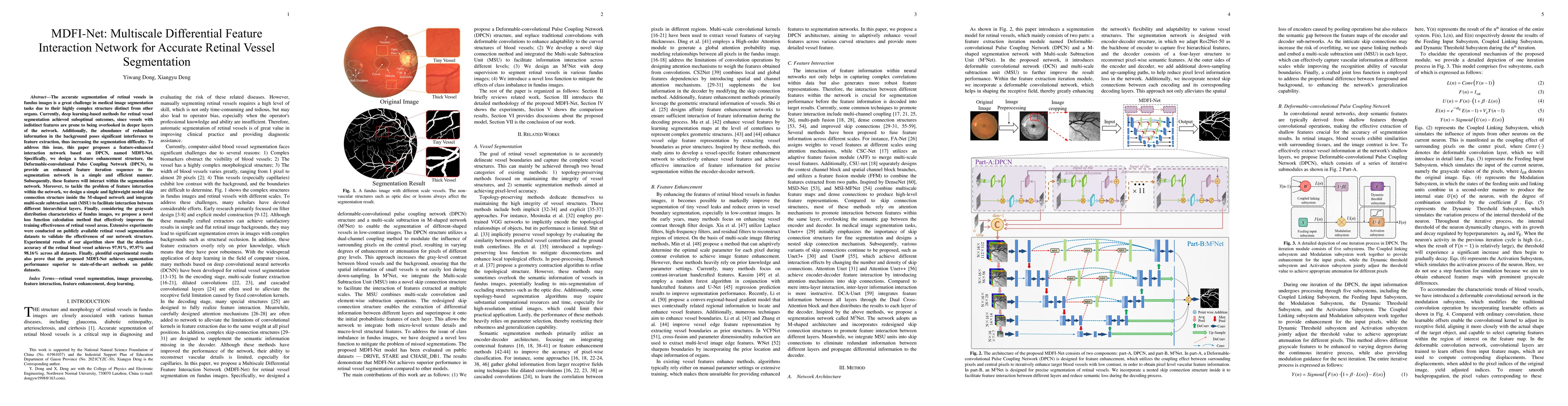 MDFI-Net introduces a multiscale differential feature interaction network to improve retinal vessel segmentation in fundus images, achieving high accuracy of 97.91-98.16%. The proposed Deformable-convolutional Pulse Coupling Network enhances feature extraction, reducing background interference and improving segmentation performance over existing methods.