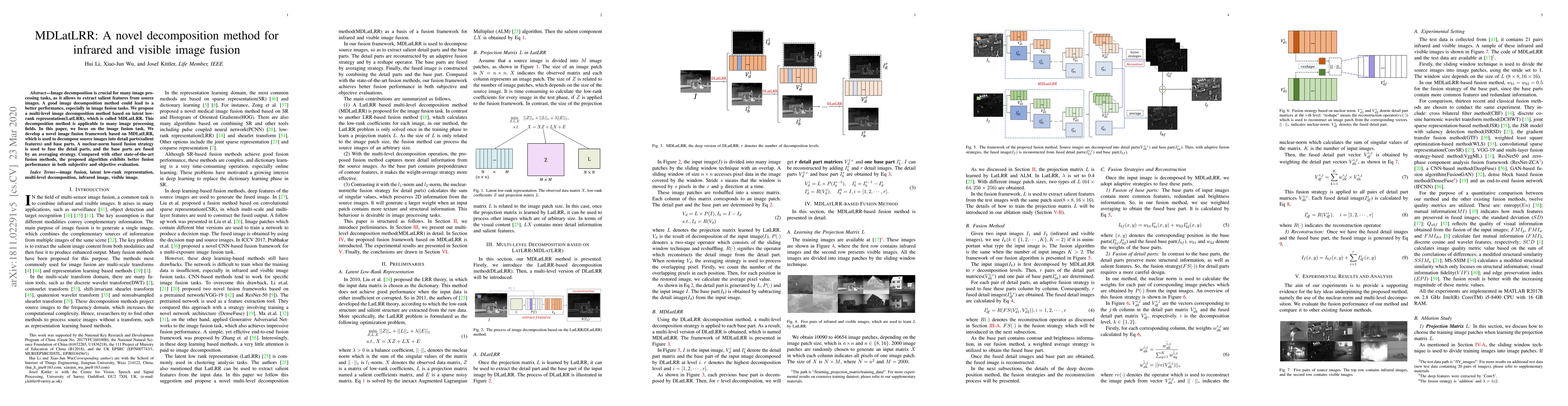 Summary: MDLatLRR is a novel multi-level image decomposition method based on latent low-rank representation for extracting salient features. The proposed image fusion framework, utilizing a nuclear-norm based fusion strategy for detail parts and averaging for base parts, outperforms other state-of-the-art fusion methods in both subjective and objective evaluations.