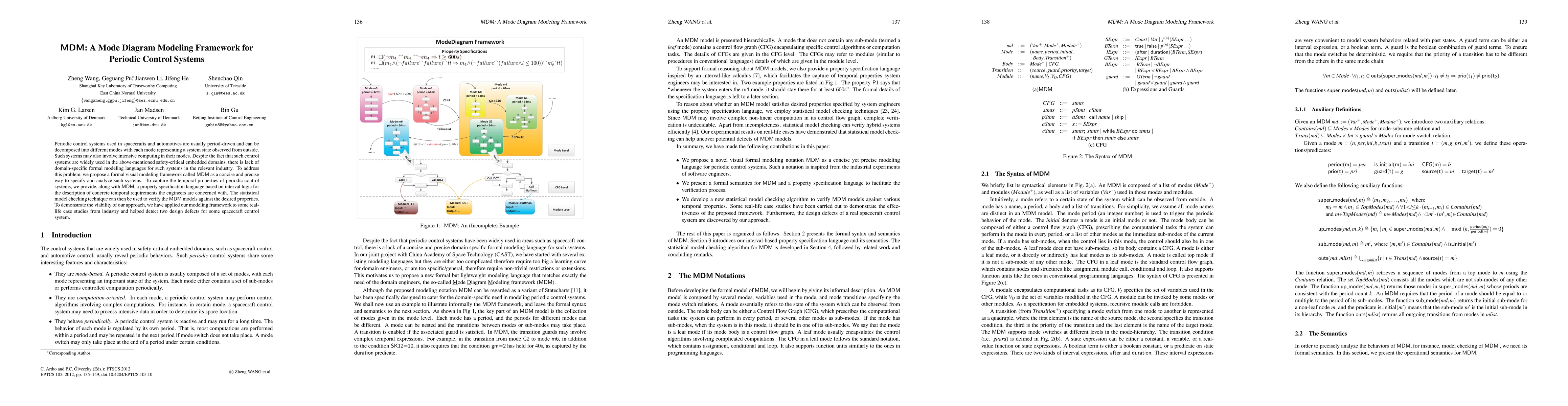 Periodic control systems used in spacecrafts and automotives are usually period-driven and can be decomposed into different modes with each mode representing a system state observed from outside. Such systems may also involve intensive computing in their modes. Despite the fact that such control systems are widely used in the above-mentioned safety-critical embedded domains, there is lack of domain-specific formal modelling languages for such systems in the relevant industry. To address this problem, we propose a formal visual modeling framework called mode diagram as a concise and precise way to specify and analyze such systems. To capture the temporal properties of periodic control systems, we provide, along with mode diagram, a property specification language based on interval logic for the description of concrete temporal requirements the engineers are concerned with. The statistical model checking technique can then be used to verify the mode diagram models against desired properties. To demonstrate the viability of our approach, we have applied our modelling framework to some real life case studies from industry and helped detect two design defects for some spacecraft control systems.