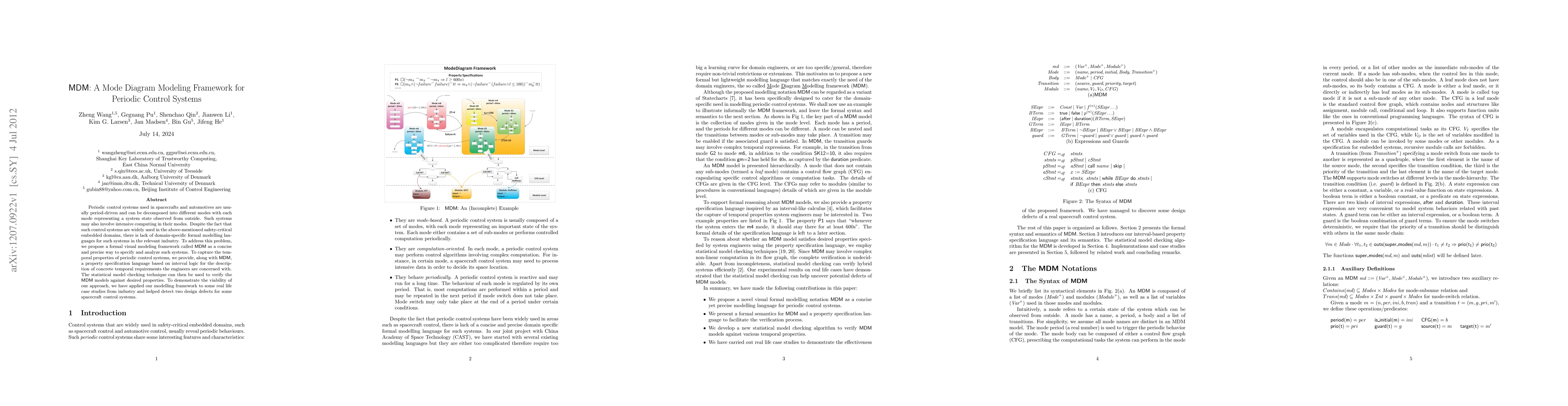 Periodic control systems used in spacecrafts and automotives are usually period-driven and can be decomposed into different modes with each mode representing a system state observed from outside. Such systems may also involve intensive computing in their modes. Despite the fact that such control systems are widely used in the above-mentioned safety-critical embedded domains, there is lack of domain-specific formal modelling languages for such systems in the relevant industry. To address this problem, we propose a formal visual modeling framework called MDM as a concise and precise way to specify and analyze such systems. To capture the temporal properties of periodic control systems, we provide, along with MDM, a property specification language based on interval logic for the description of concrete temporal requirements the engineers are concerned with. The statistical model checking technique can then be used to verify the MDM models against desired properties. To demonstrate the viability of our approach, we have applied our modelling framework to some real life case studies from industry and helped detect two design defects for some spacecraft control systems.