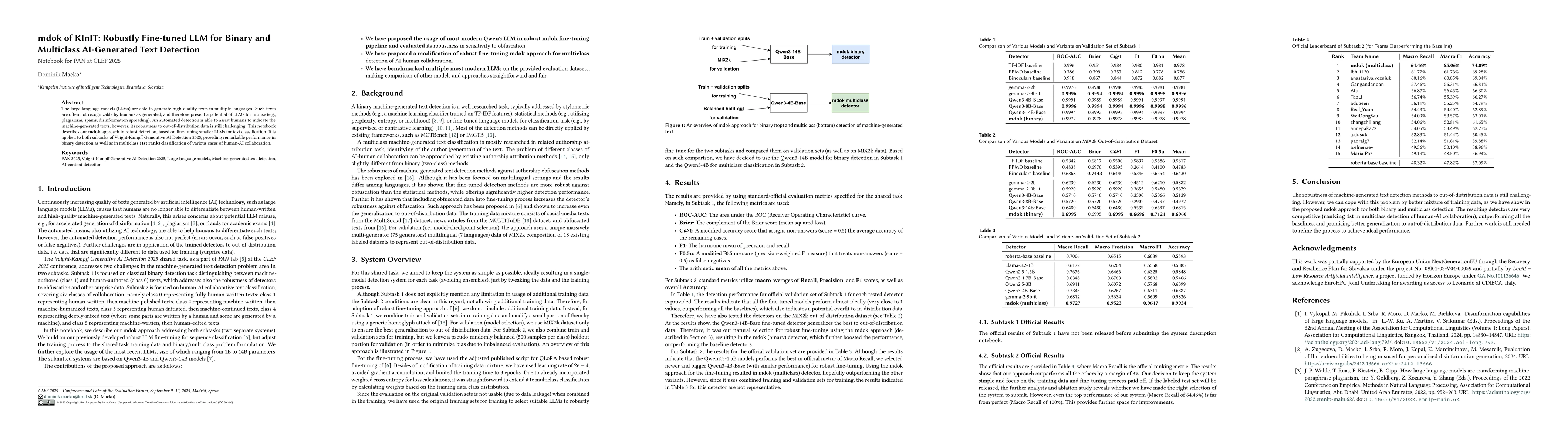 The large language models (LLMs) are able to generate high-quality texts in multiple languages. Such texts are often not recognizable by humans as generated, and therefore present a potential of LLMs for misuse (e.g., plagiarism, spams, disinformation spreading). An automated detection is able to assist humans to indicate the machine-generated texts; however, its robustness to out-of-distribution data is still challenging. This notebook describes our mdok approach in robust detection, based on fine-tuning smaller LLMs for text classification. It is applied to both subtasks of Voight-Kampff Generative AI Detection 2025, providing remarkable performance in binary detection as well as in multiclass (1st rank) classification of various cases of human-AI collaboration.