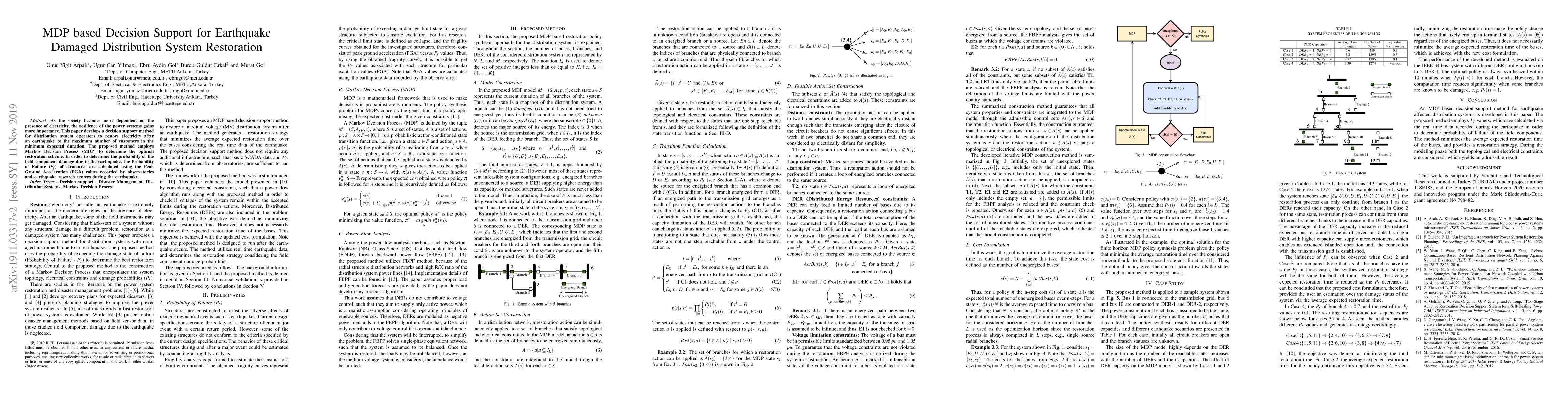 This paper proposes an MDP-based decision support method for restoring electricity to the maximum number of customers after an earthquake by determining the optimal restoration scheme. The method calculates the Probability of Failure ($P_f$) of structures using Peak Ground Acceleration (PGA) values to assess field component damage.