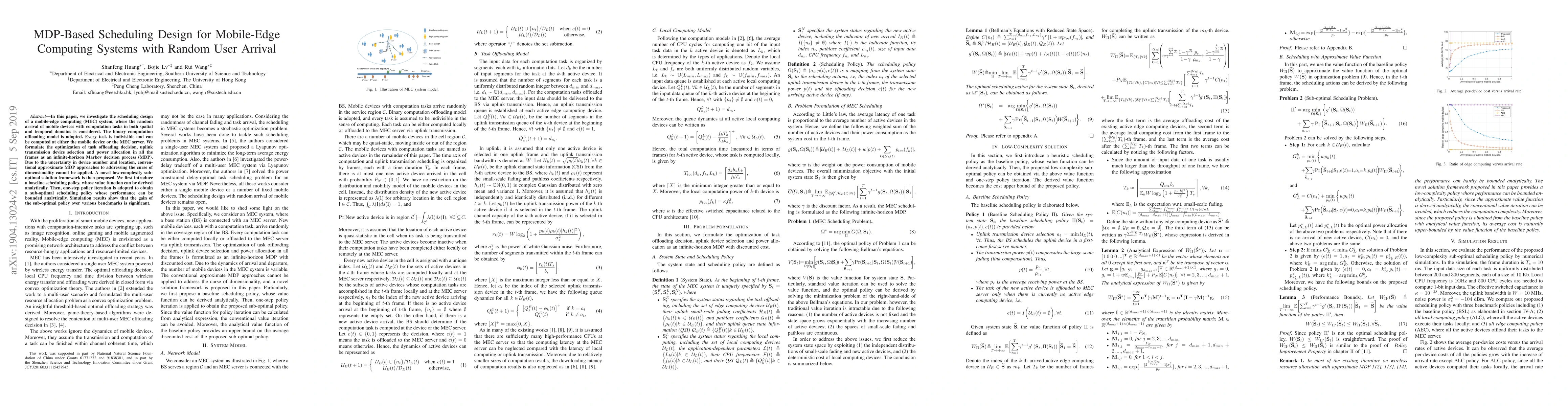 In this paper, we investigate the scheduling design of a mobile-edge computing (MEC) system, where the random arrival of mobile devices with computation tasks in both spatial and temporal domains is considered. The binary computation offloading model is adopted. Every task is indivisible and can be computed at either the mobile device or the MEC server. We formulate the optimization of task offloading decision, uplink transmission device selection and power allocation in all the frames as an infinite-horizon Markov decision process (MDP). Due to the uncertainty in device number and location, conventional approximate MDP approaches to addressing the curse of dimensionality cannot be applied. A novel low-complexity sub-optimal solution framework is then proposed. We first introduce a baseline scheduling policy, whose value function can be derived analytically. Then, one-step policy iteration is adopted to obtain a sub-optimal scheduling policy whose performance can be bounded analytically. Simulation results show that the gain of the sub-optimal policy over various benchmarks is significant.