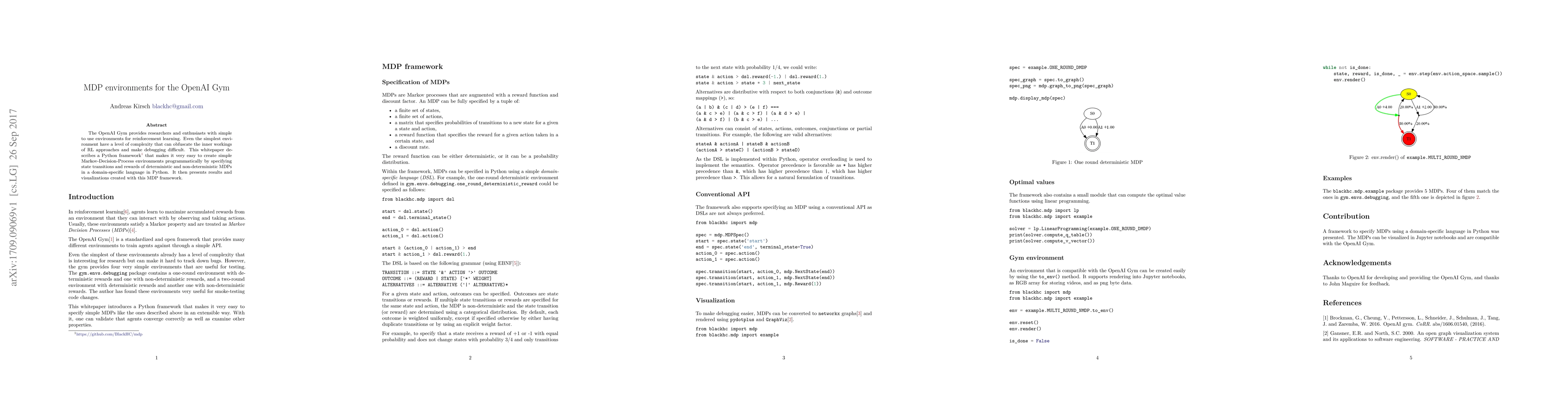 This paper introduces a Python framework for creating simple Markov-Decision-Process (MDP) environments in the OpenAI Gym, facilitating the specification of state transitions and rewards in a domain-specific language. It demonstrates the framework's utility through results and visualizations.