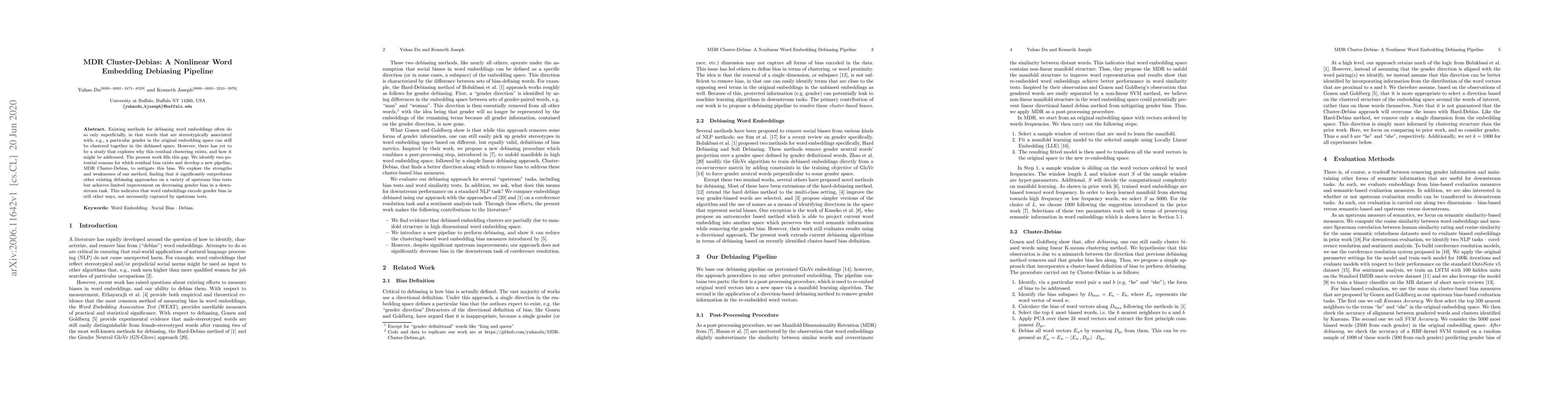 A new debiasing pipeline, MDR Cluster-Debias, is introduced to address residual clustering in word embeddings after superficial debiasing methods. It significantly outperforms existing approaches on upstream bias tests but shows limited improvement on decreasing gender bias in downstream tasks.