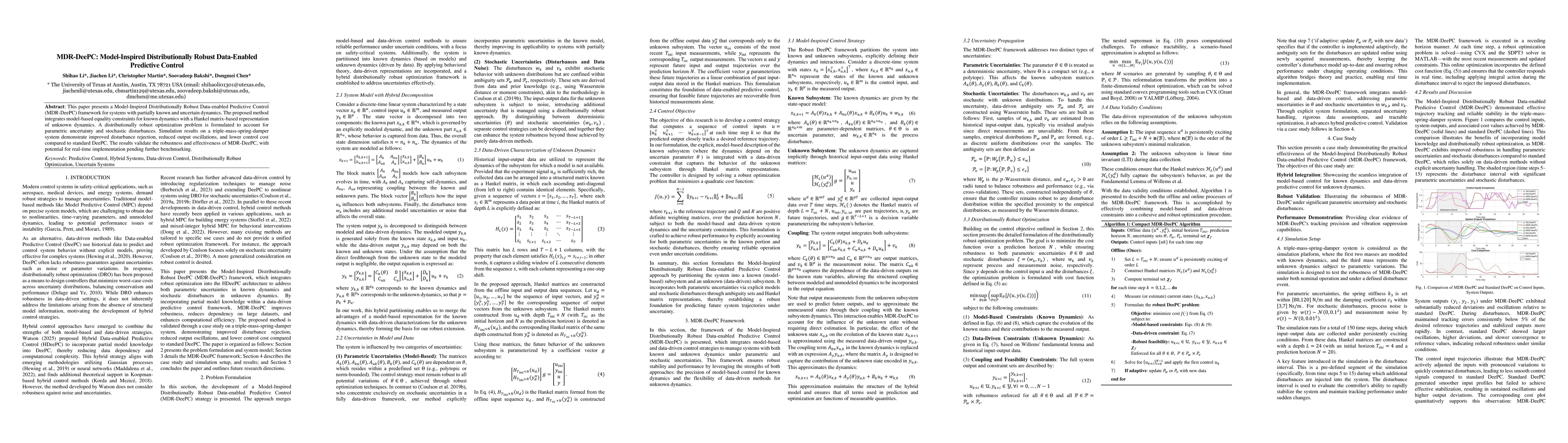 This paper presents a Model-Inspired Distributionally Robust Data-enabled Predictive Control (MDR-DeePC) framework for systems with partially known and uncertain dynamics. The proposed method integrates model-based equality constraints for known dynamics with a Hankel matrix-based representation of unknown dynamics. A distributionally robust optimization problem is formulated to account for parametric uncertainty and stochastic disturbances. Simulation results on a triple-mass-spring-damper system demonstrate improved disturbance rejection, reduced output oscillations, and lower control cost compared to standard DeePC. The results validate the robustness and effectiveness of MDR-DeePC, with potential for real-time implementation pending further benchmarking.